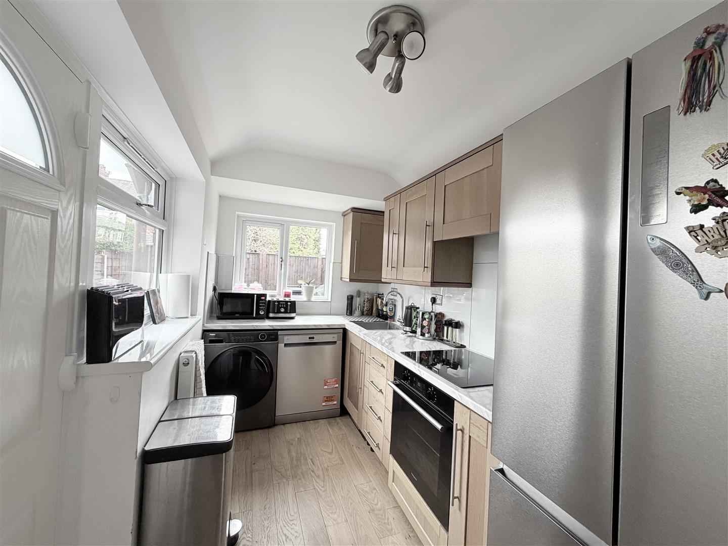 Fitted with a matching range of base and eye level units with worktop space over, inset sink and drainer with mixer tap, plumbing for washing machine and dishwasher, space for fridge/freezer, built-in oven, built-in hob with extractor hood over, double glazed window to rear, double glazed window to side, door to side leading out to rear garden.