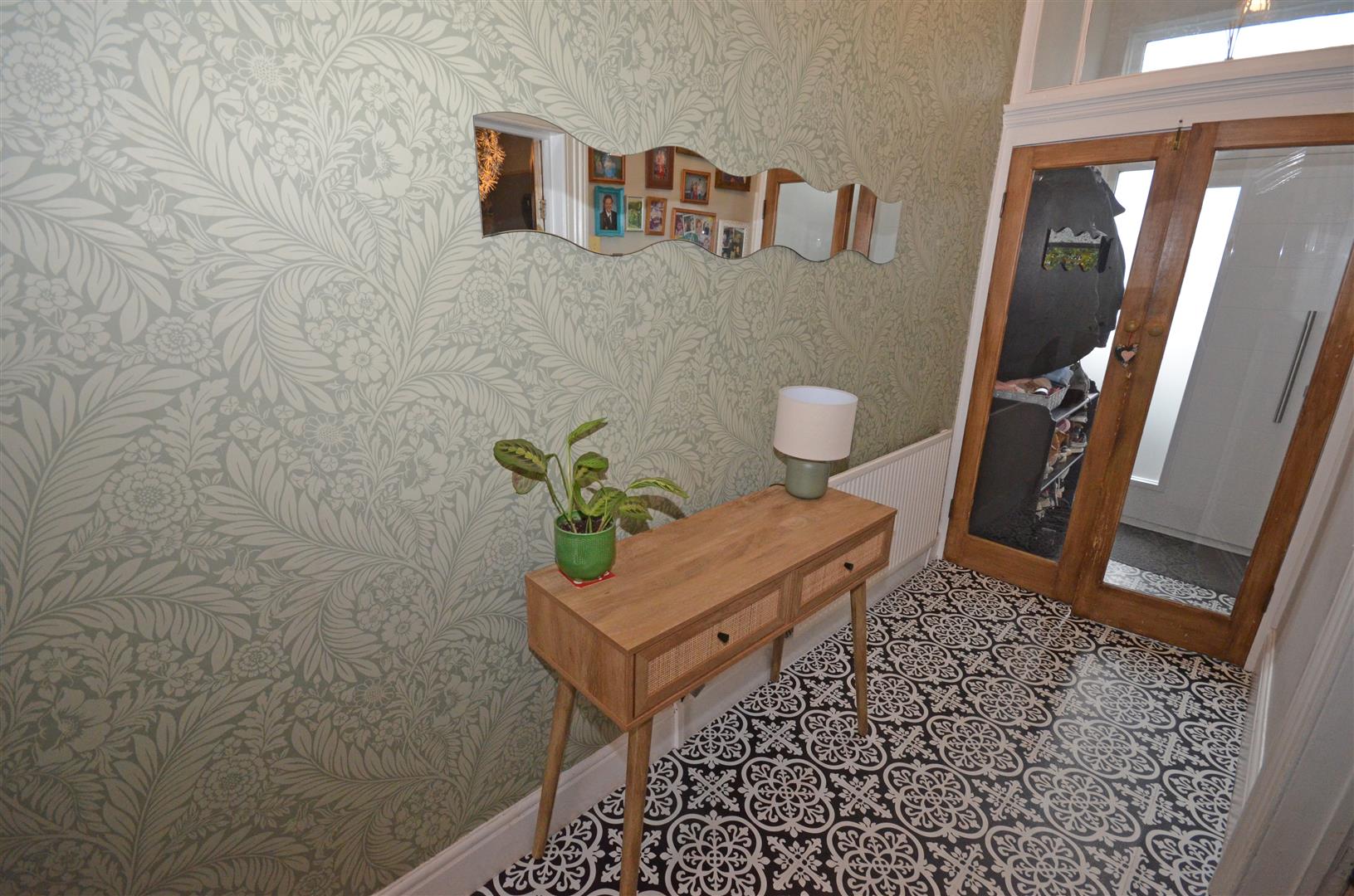 Newly fitted composite front door with window above, decorative flooring and double doors to the entrance hallway.