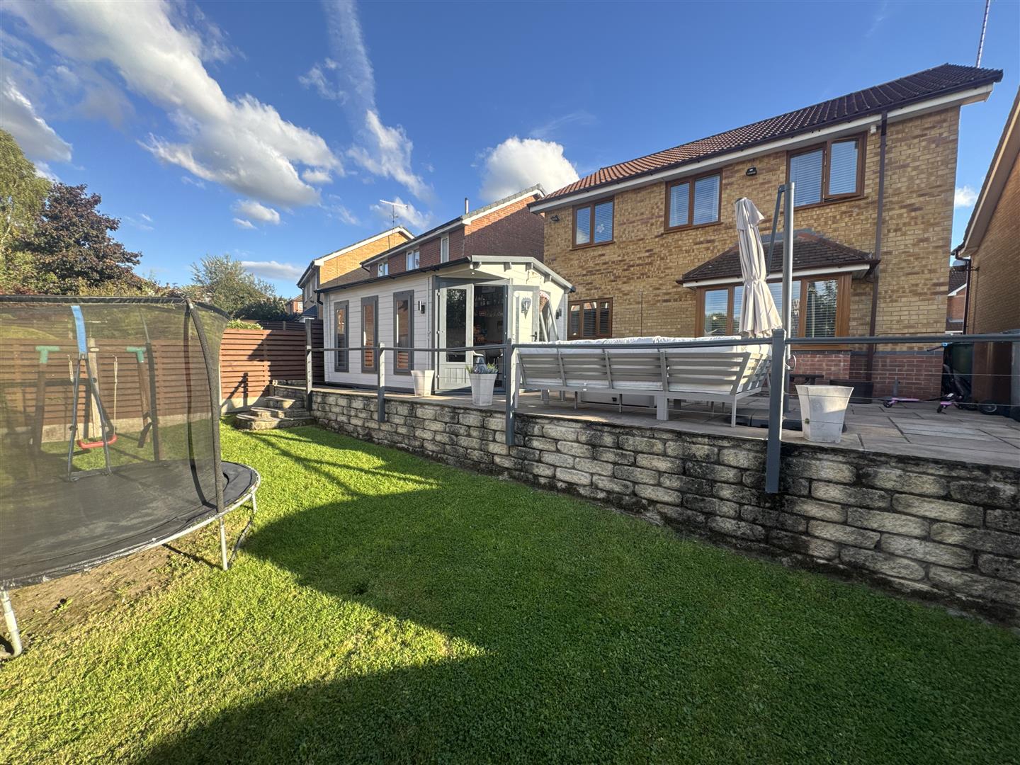 Externally, the property features a neat lawned garden to the front and a driveway providing ample off-road parking, leading to an integral garage which offers further storage. To the rear is an enclosed garden comprising of a paved patio area that extends down the side of the home, ideal for outdoor dining and summer barbecues, and this in turn leads to a versatile garden room that can be used as a bar, home office, gym, or creative studio. Steps lead down to a lower lawned garden, creating a private and family-friendly outdoor haven with plenty of room for children to play or for hosting gatherings.