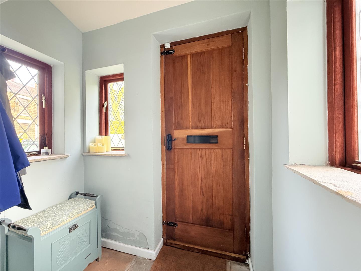 Door to front, two double glazed windows to side, double glazed window to front, door leading to: