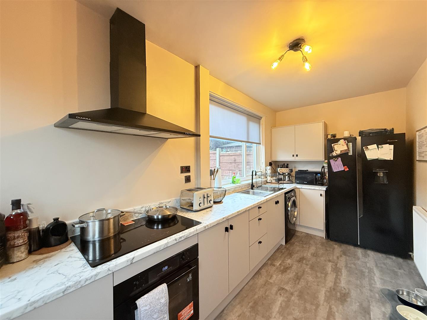 Fitted with a matching range of base and eye level units with worktop space over, inset sink and drainer with mixer tap, tiled splashbacks, plumbing for washing machine, space for fridge/freezer, built-in oven, built-in hob with extractor hood over , double glazed window to side, double glazed window to rear, radiator, door to storage cupboard, door leading out to side.