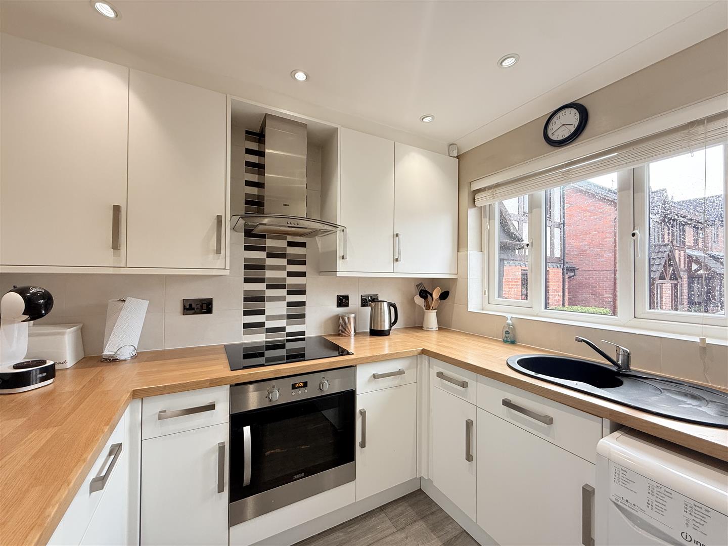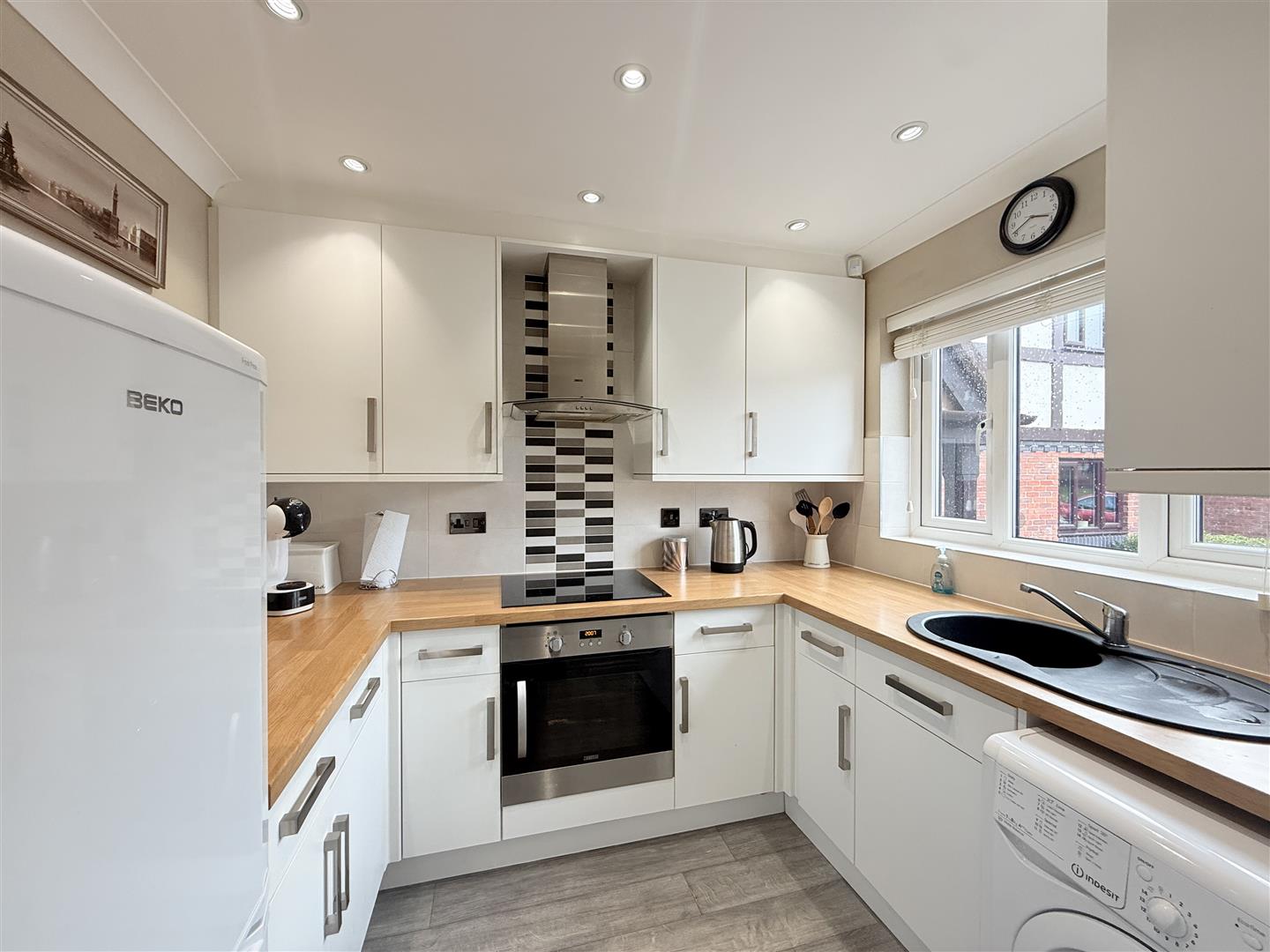 Fitted with a matching range of base and eye level units with worktop space over, inset sink and drainer with mixer tap, tiled splashbacks, plumbing for washing machine, space for fridge/freezer, built-in oven, built-in hob with extractor hood over, double glazed window to front, radiator, door to storage cupboard.