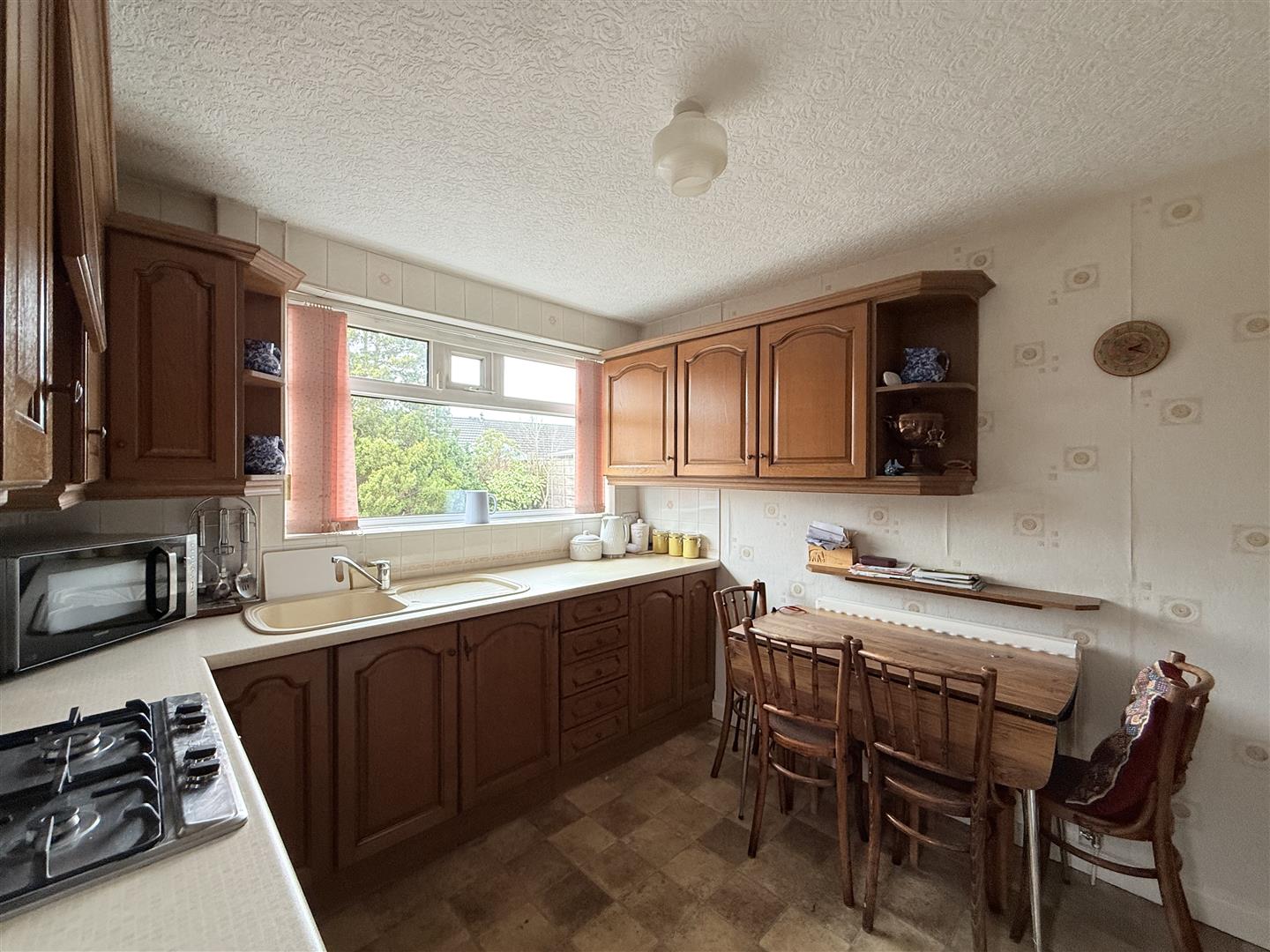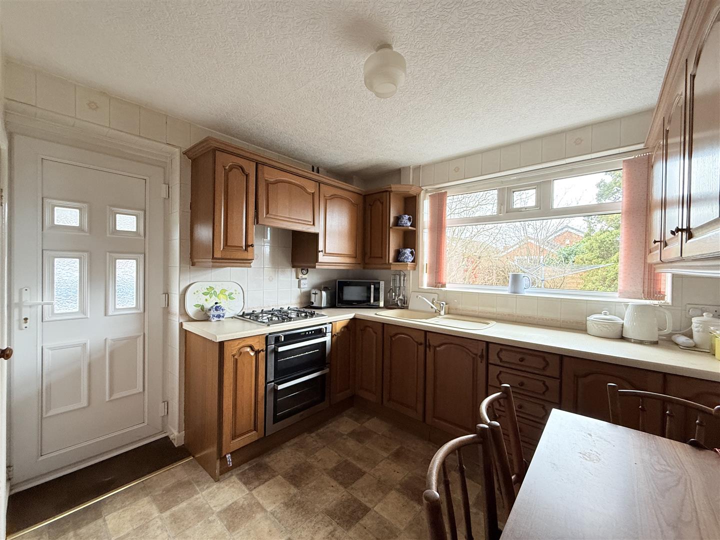 Fitted with a matching range of base and eye level units with worktop space over, inset sink and drainer with mixer tap, tiled splashbacks, built-in oven, built-in hob with extractor hood over, double glazed window to rear, radiator, door to storage cupboard, door leading out to side.