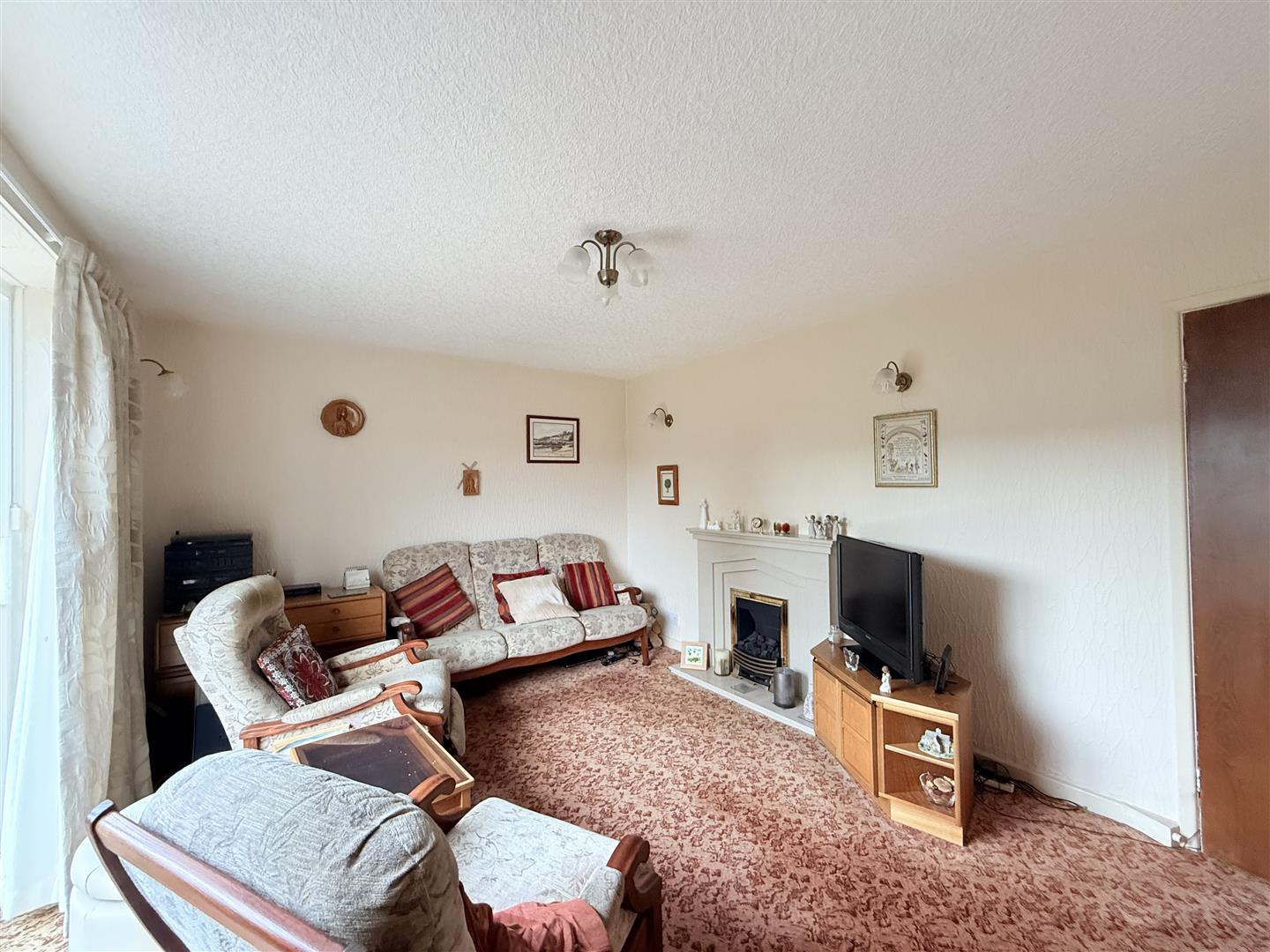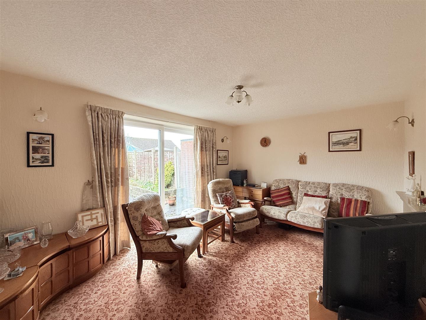 Feature fireplace with inset living flame effect fire, radiator, double glazed sliding patio door opening to rear garden.