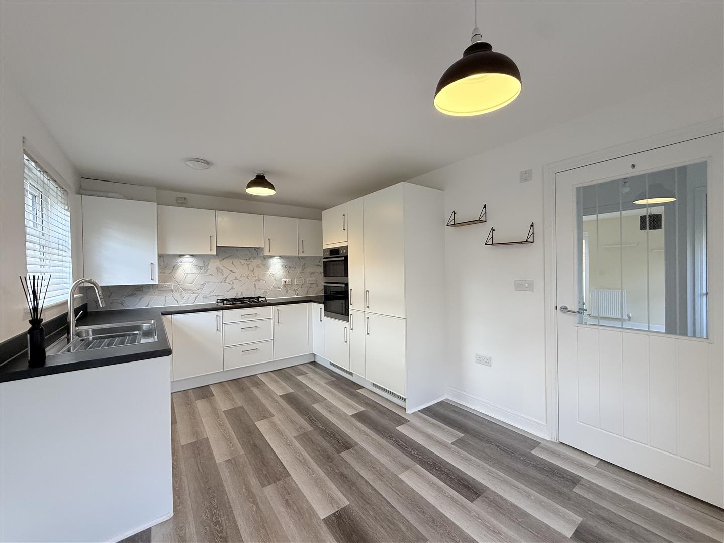 Fitted with a matching range of base and eye level units with worktop space over, inset sink and drainer with mixer tap, built-in eye level double oven, built-in hob with extractor hood over, double glazed window to front, double glazed window to side, radiator.