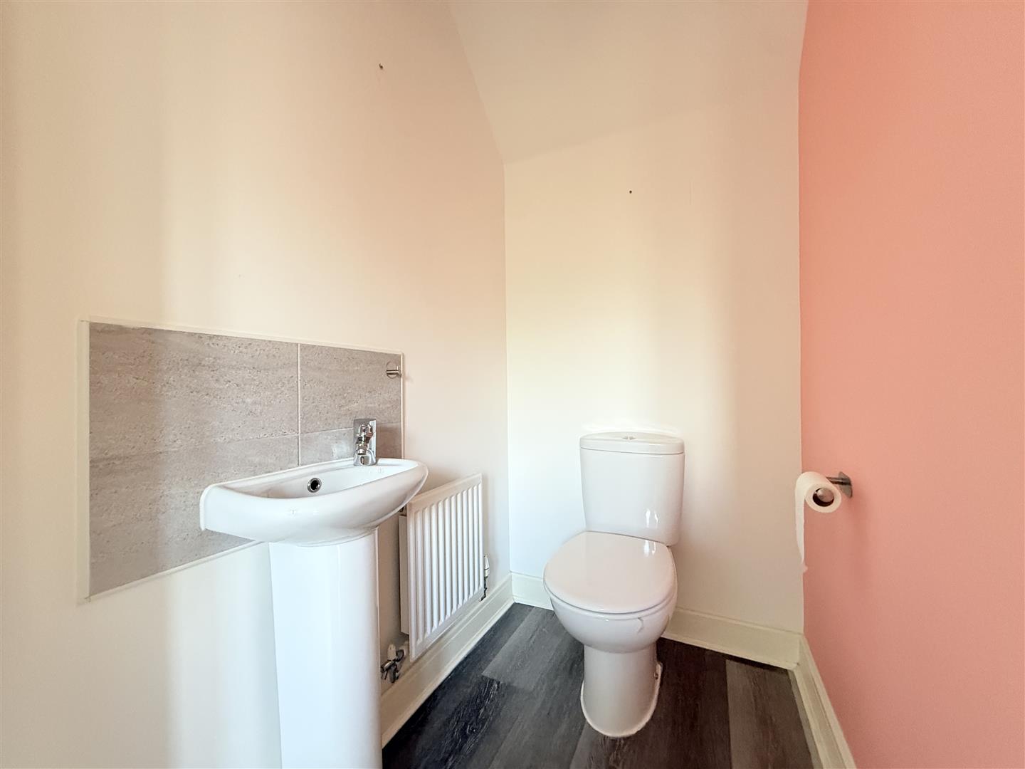 Two piece suite comprising, pedestal wash hand basin and low-level WC, radiator.