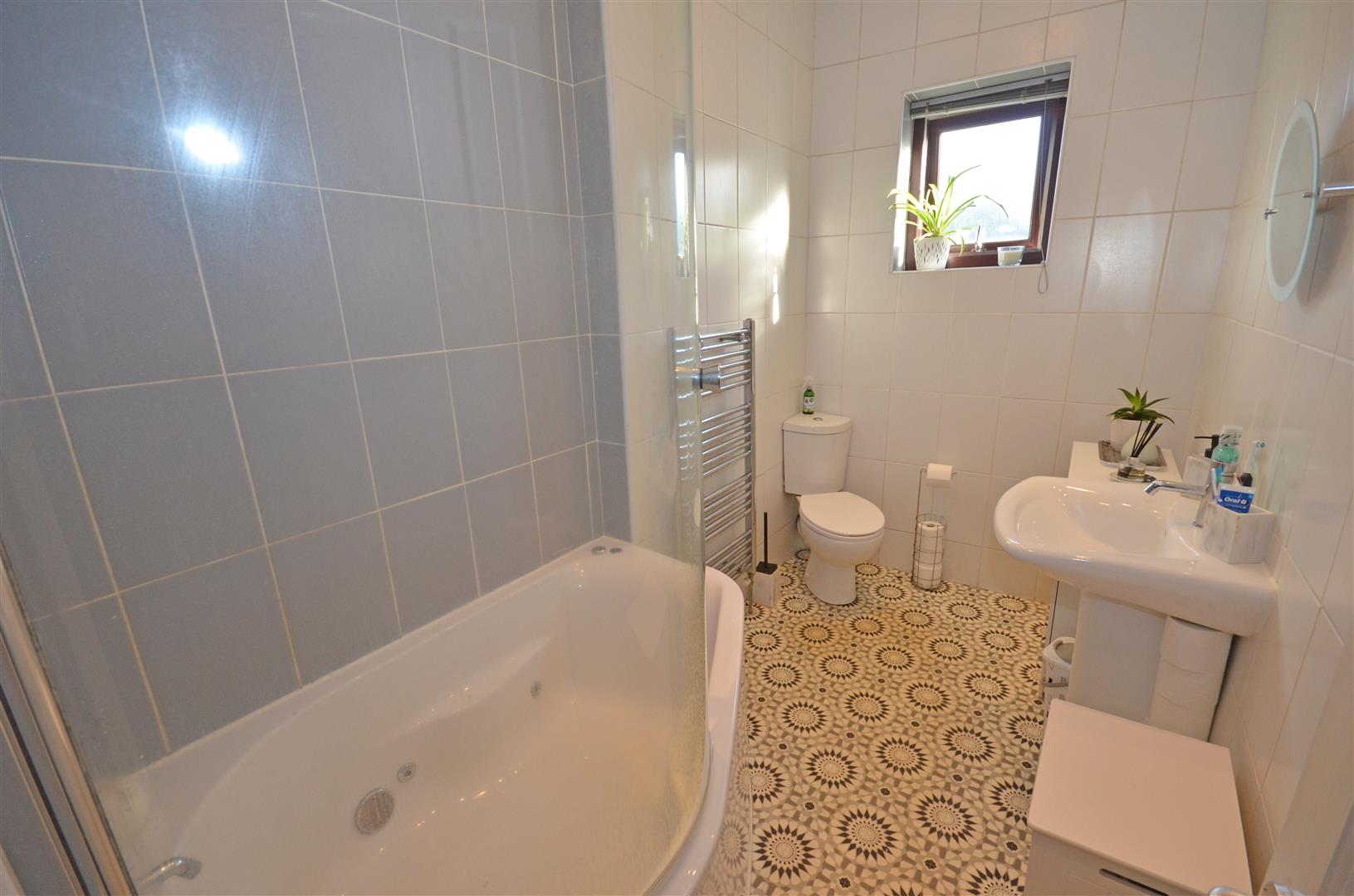 Contemporary fitted bathroom suite with jacuzzi whirlpool bath with electric shower over and shower screen, pedestal wash hand basin, low level WC, double glazed window to rear, tiled walls, and heated towel rail.