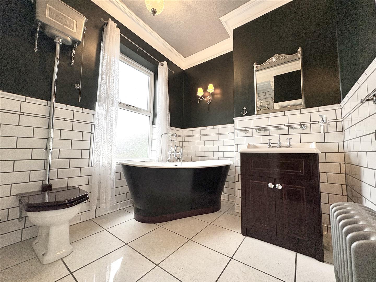 Four piece suite comprising free standing roll top bath with Victorian style shower tap attachment, vanity wash hand basin, tiled double shower enclosure and high-level flush WC, part tiled walls, double glazed window to side, radiator.