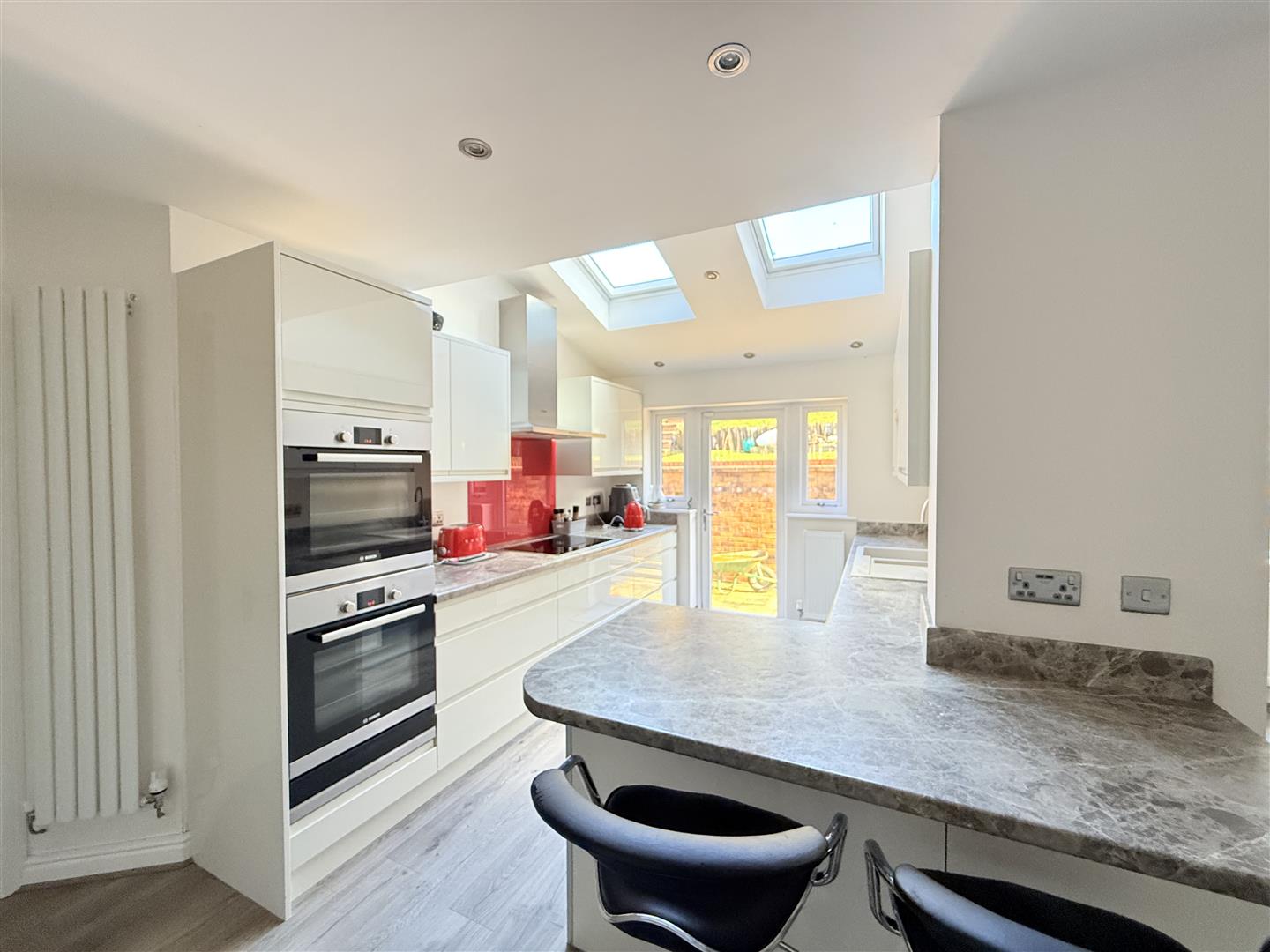 Fitted with a matching range of base and eye level units with worktop space over, matching breakfast bar, inset sink and drainer with mixer tap, integrated dishwasher, space for fridge/freezer, built-in eye level double oven and warmer drawer, built-in induction hob with extractor hood over, two double glazed windows to rear, two double glazed velux windows, two radiators, door leading out to rear garden.