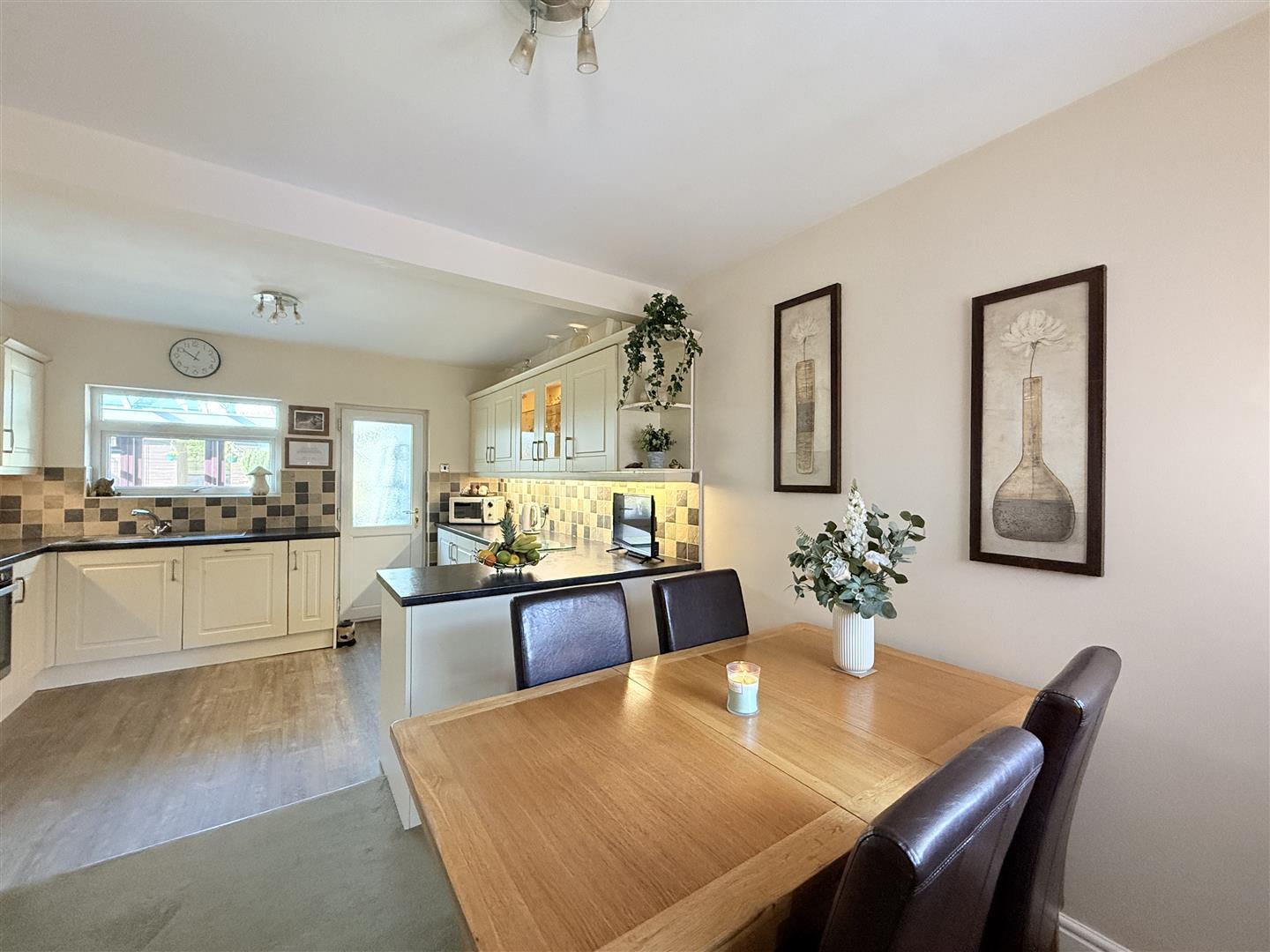 Fitted with a matching range of base and eye level units with worktop space over, inset sink and drainer with mixer tap, tiled splashbacks, integrated fridge/freezer, integrated dishwasher, free standing washing machine, built-in oven, built-in hob with extractor hood over, Worcester boiler (6 yrs old ) double glazed window to front, double glazed window to rear, radiator, door leading to: