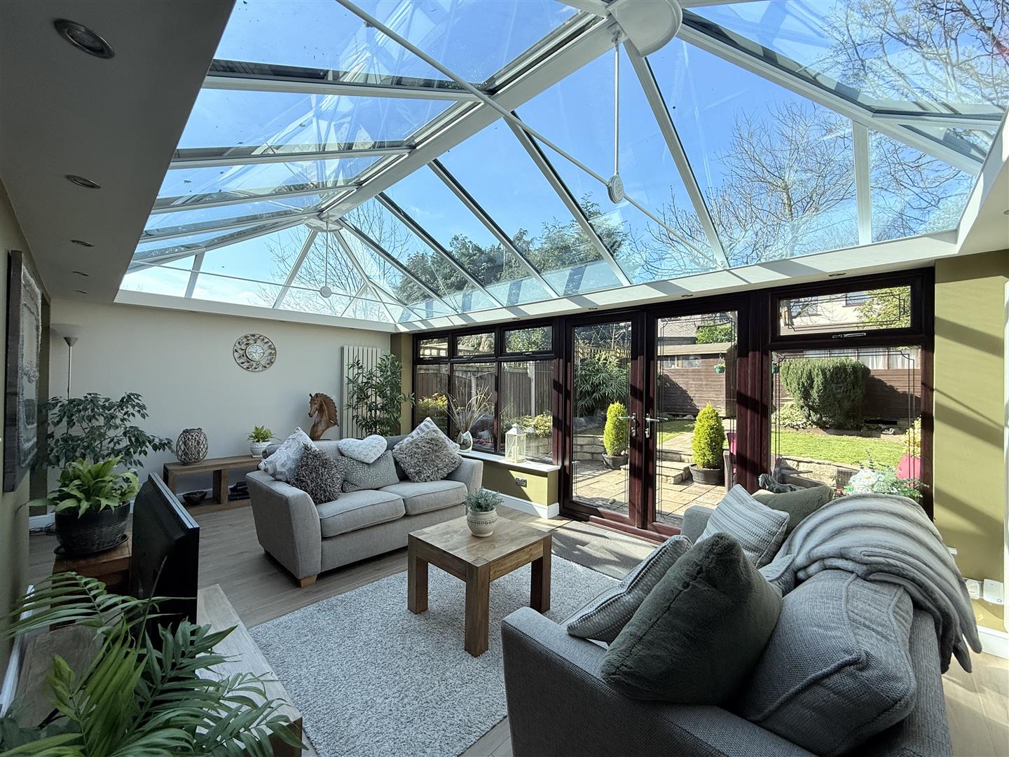 Two double glazed windows to rear, two radiators, glazed lantern roof, double glazed French doors leading out to rear garden.