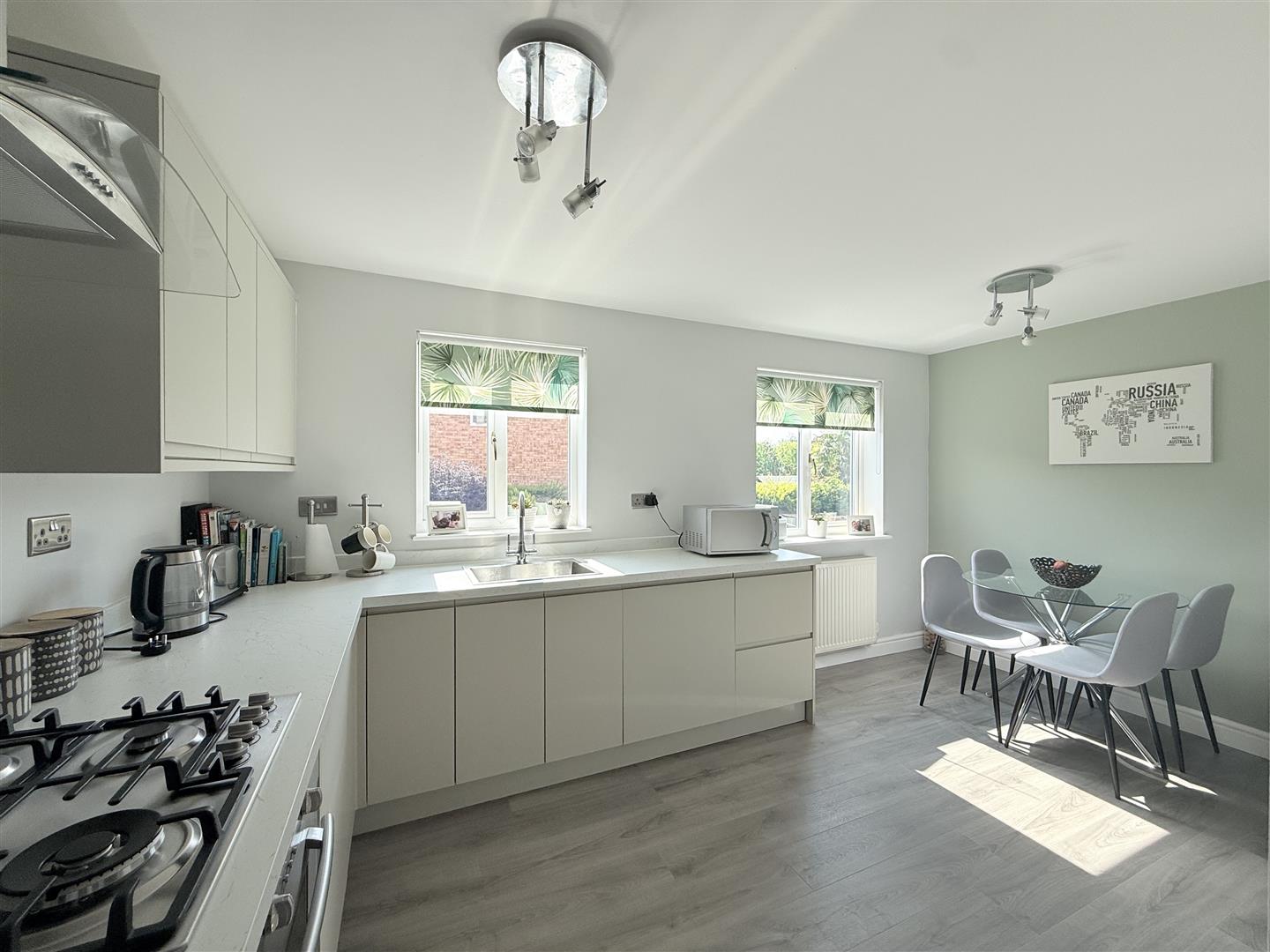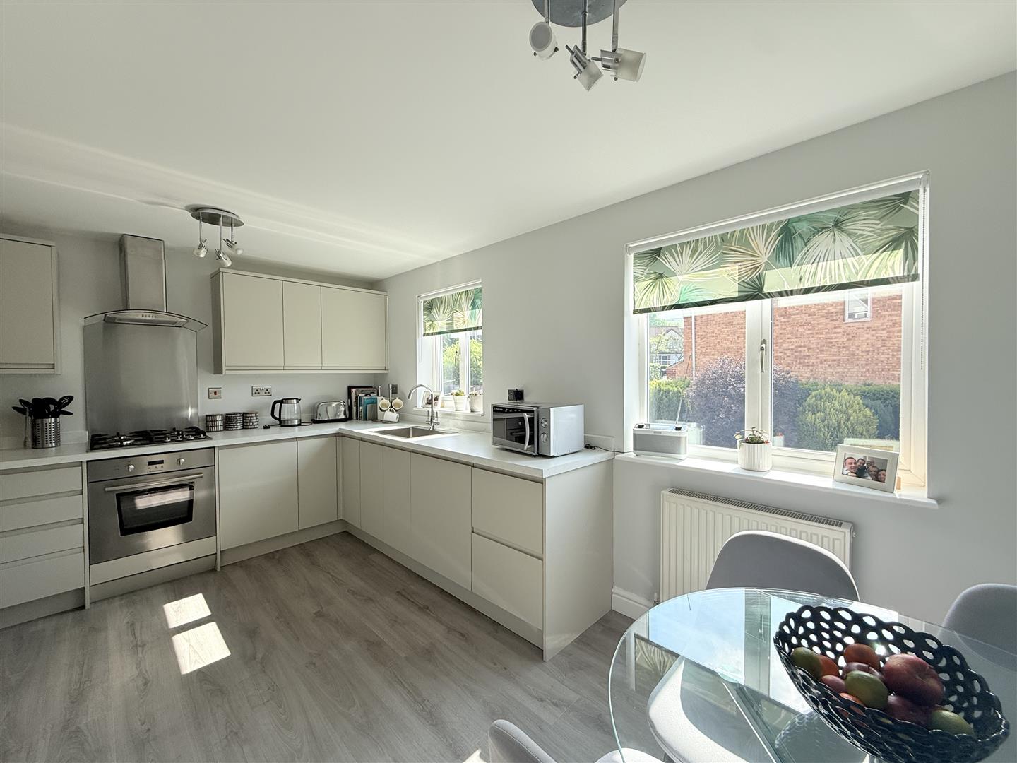 Fitted with a matching range of base and eye level units with worktop space over, inset sink with mixer tap, integrated fridge/freezer and dishwasher, built-in oven, built-in hob with extractor hood over, two double glazed windows to rear, radiator.