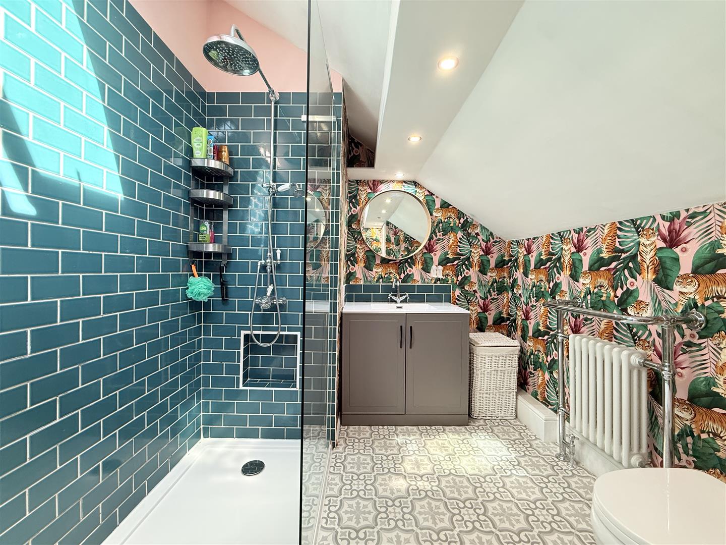 Skylight, heated towel rail, door to: