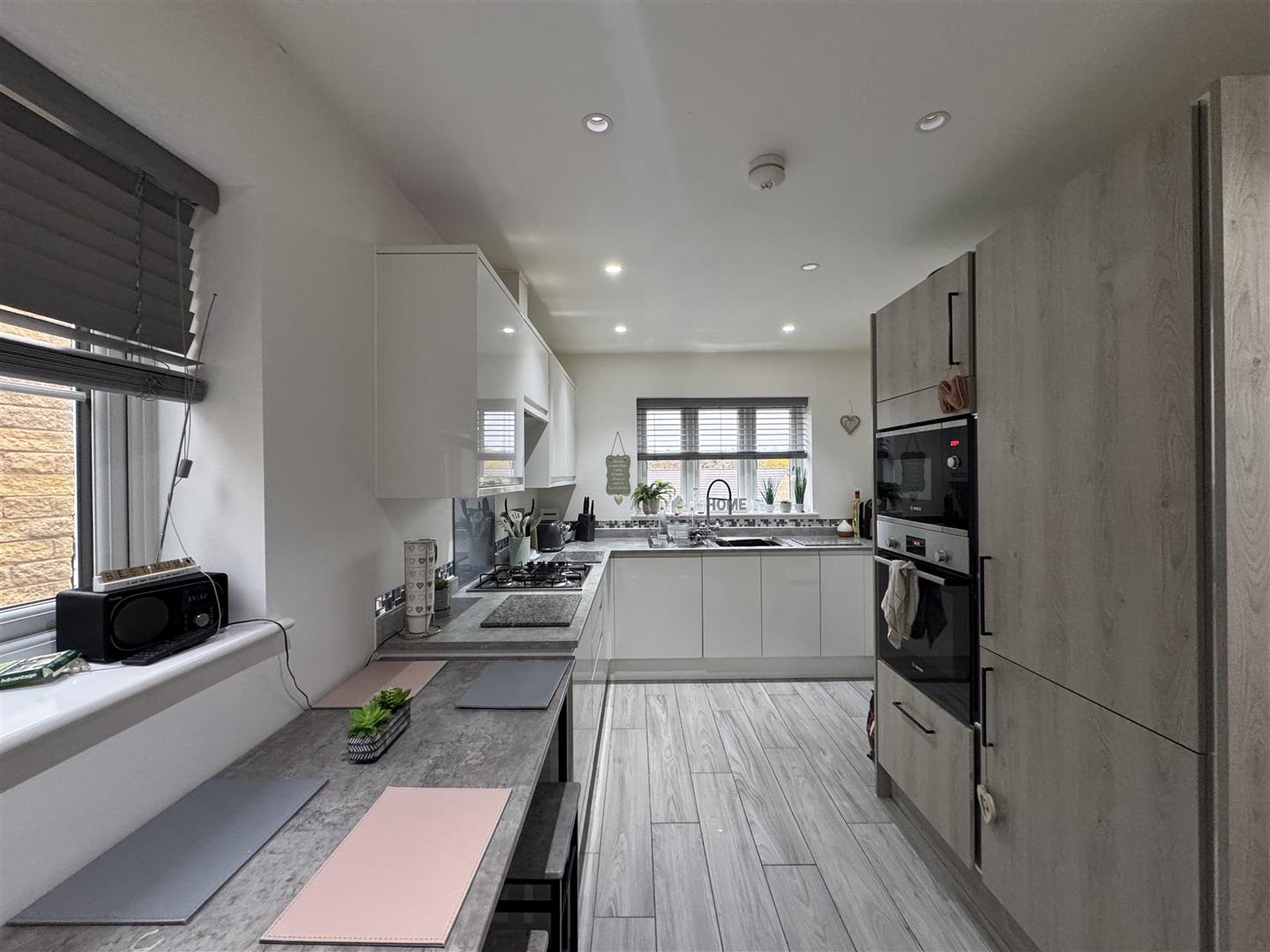 Fitted with a range of base and eye level units with worktop space over, inset sink and drainer with mixer tap, built-in eye level oven, built-in hob with extractor hood over, built-in microwave, double glazed window to side, double glazed window to front.