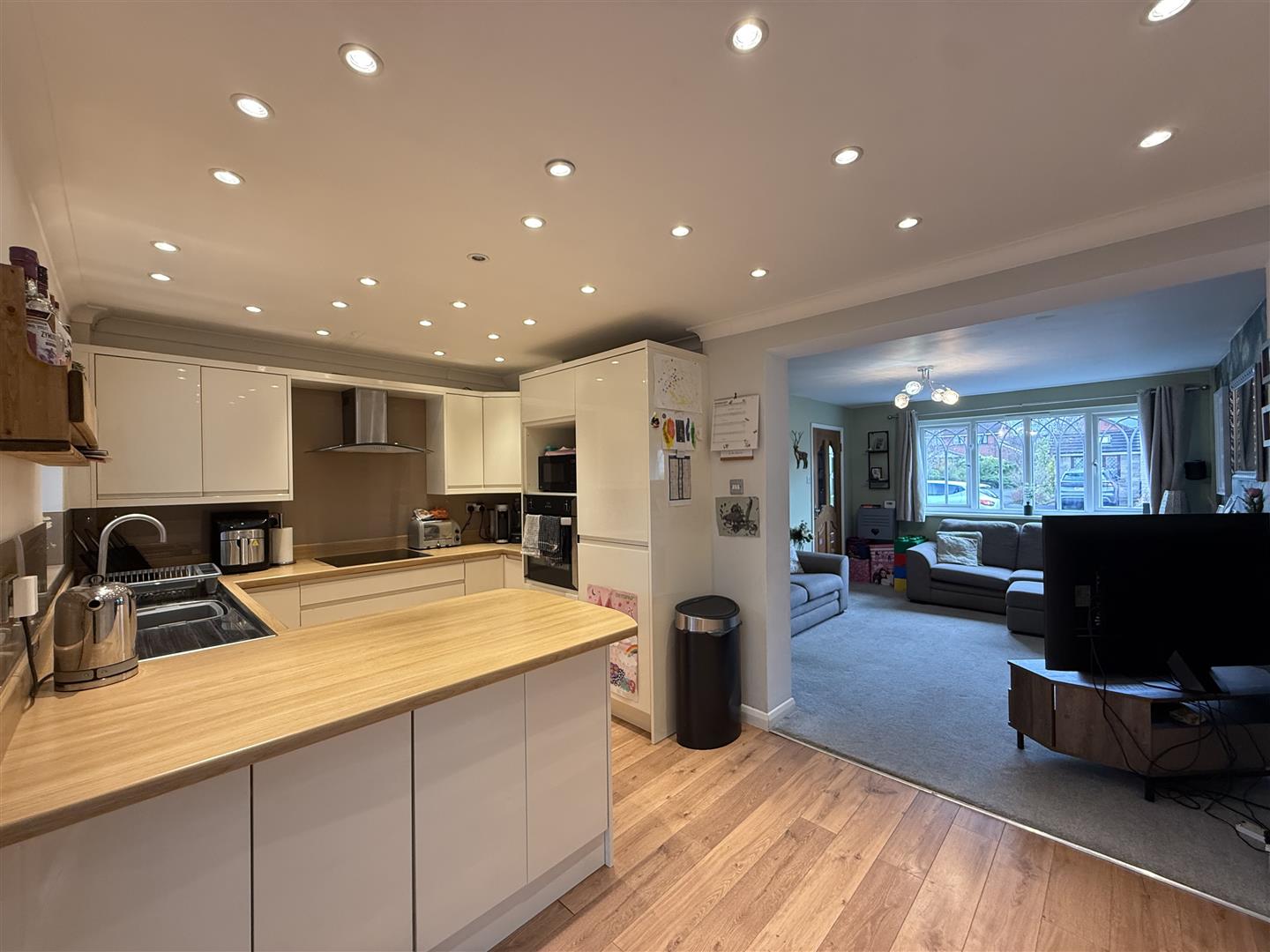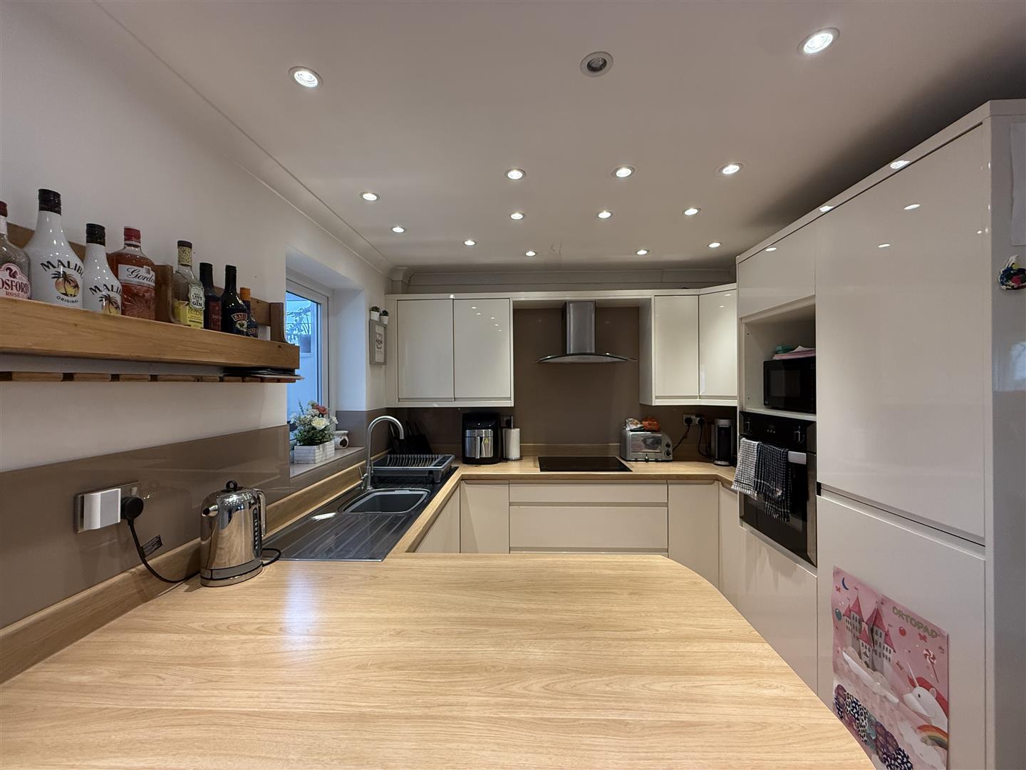 Fitted with a matching range of base and eye level units with worktop space over, sink with double drainer, mixer tap and acrylic, built-in fridge/freezer and washing machine, built-in oven, built-in hob with extractor hood over, built-in microwave, double glazed window to rear, double glazed french door, open plan, door to: