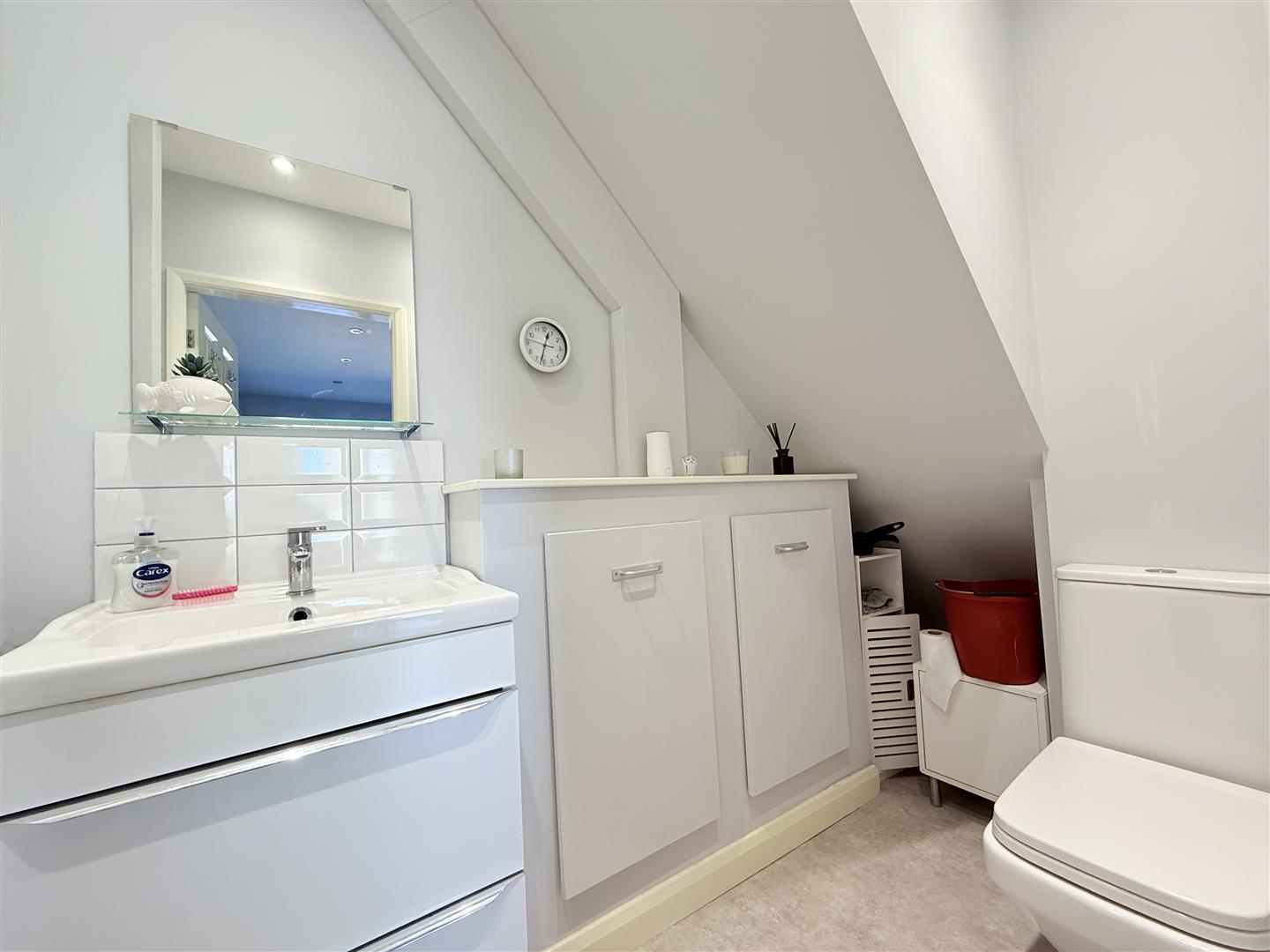 Three piece suite comprising, walk-in shower area, vanity wash hand basin and low-level WC, double glazed window to side.
