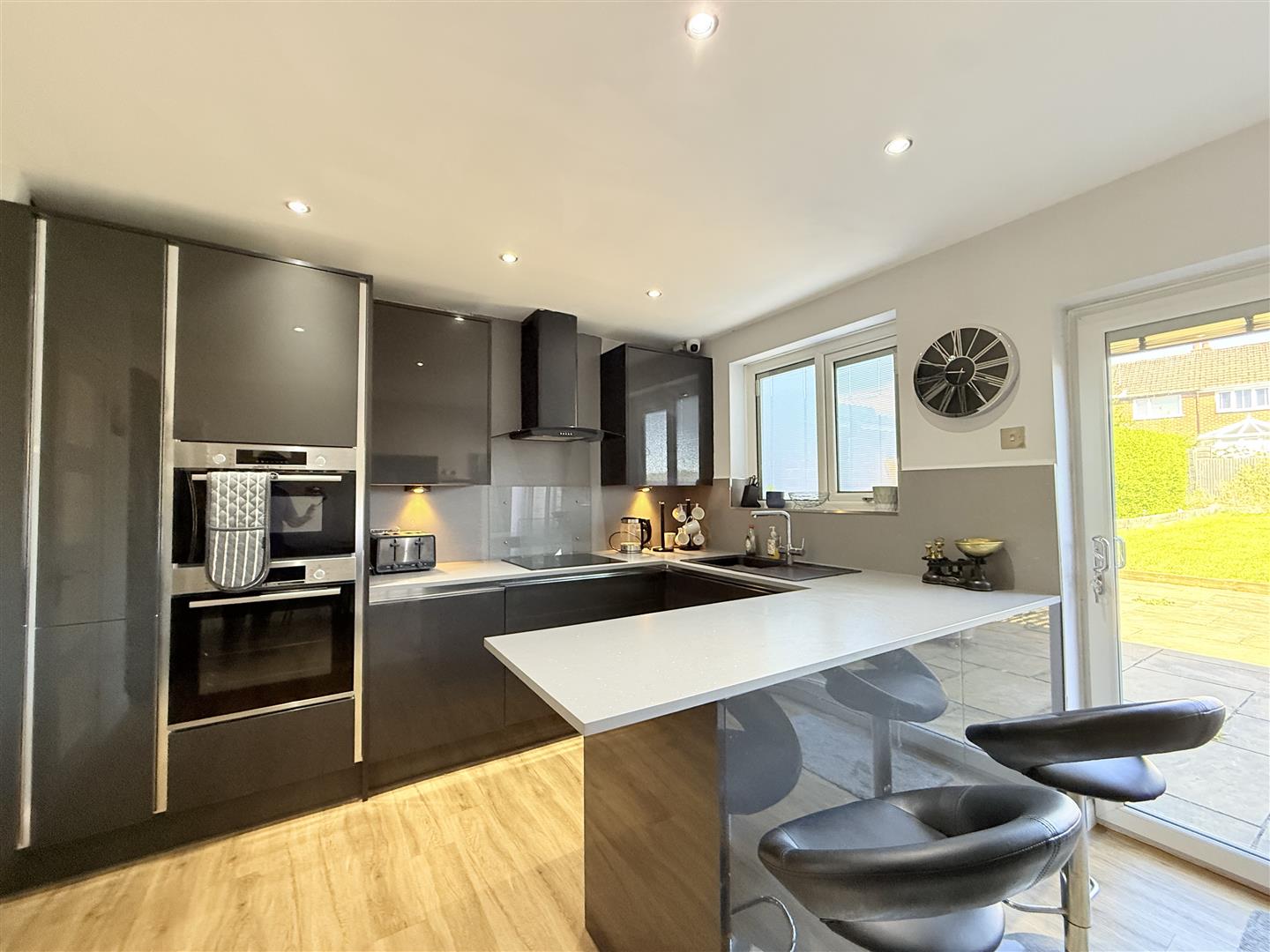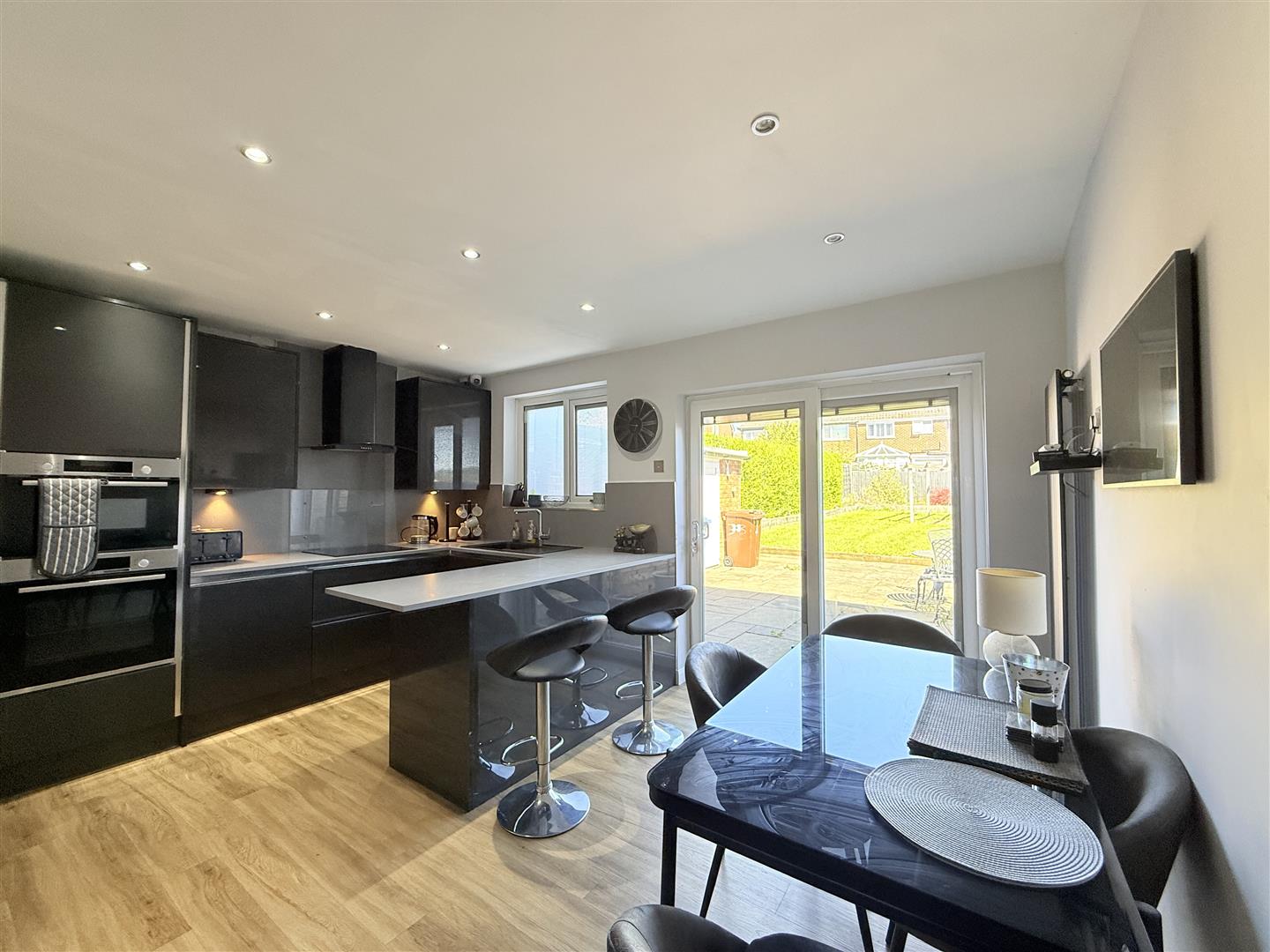 Fitted with a matching range of base and eye level units with worktop space over, inset sink and drainer with mixer tap, built-in eye level double oven, built-in hob with extractor hood over, double glazed window to rear, radiator, double glazed sliding patio door leading out to rear garden, door leading to: