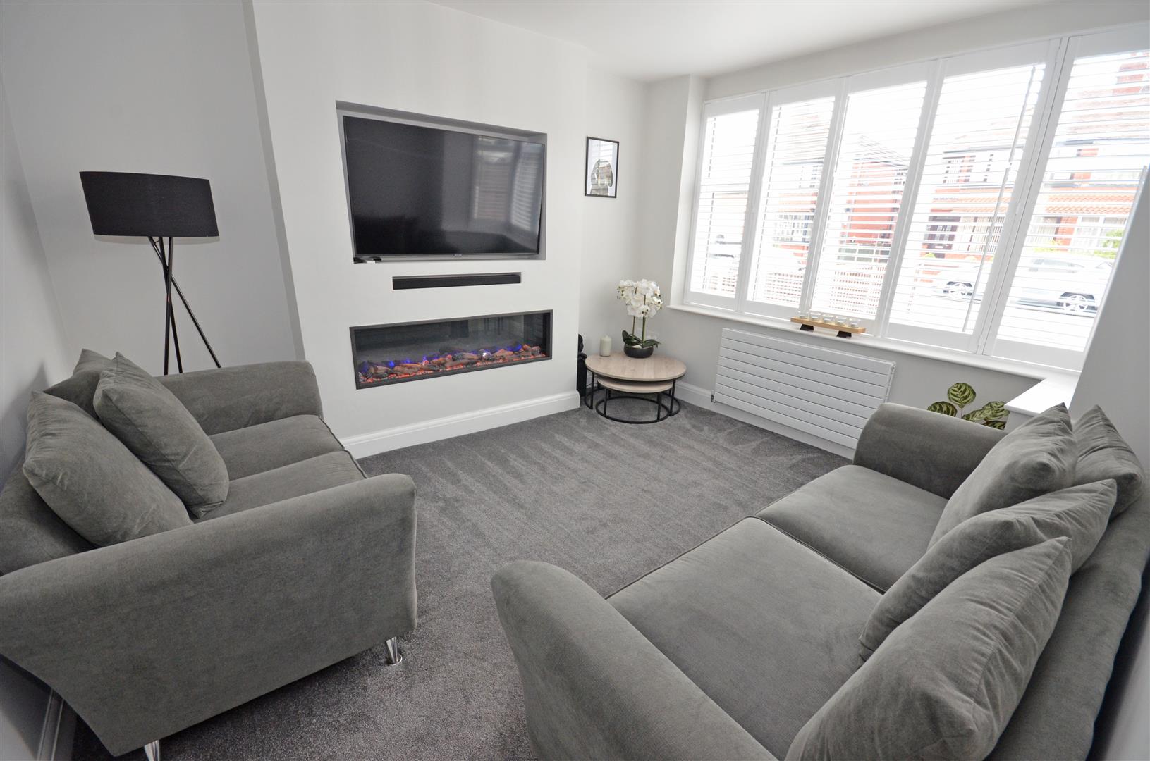 Large Upvc double glazed window to front and side, media wall with integrated electric living flame effect fire inset, TV aerial point, newly carpeted, radiator.