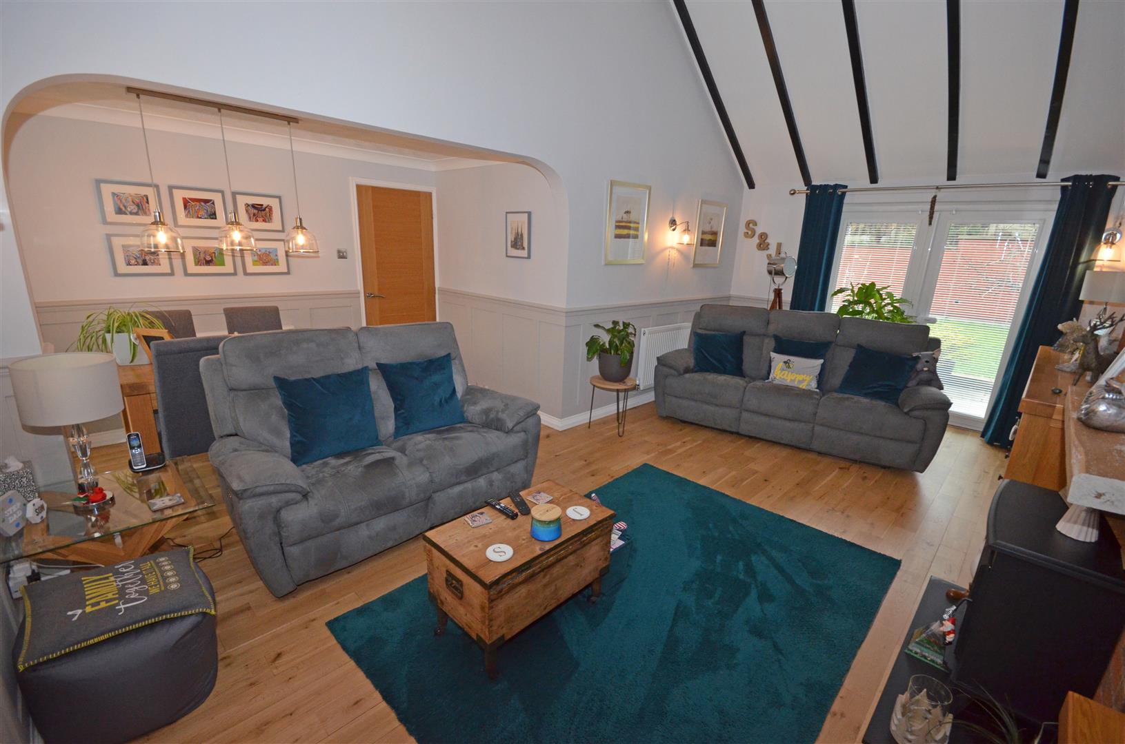 Superb open plan lounge & dining room with feature exposed brick wall and elevated ceiling, three windows and double glazed patio doors leading to the rear garden, Oak wooden flooring, TV aerial point, decorative wood panelled walls, wall light points, ceiling cornices, radiators.