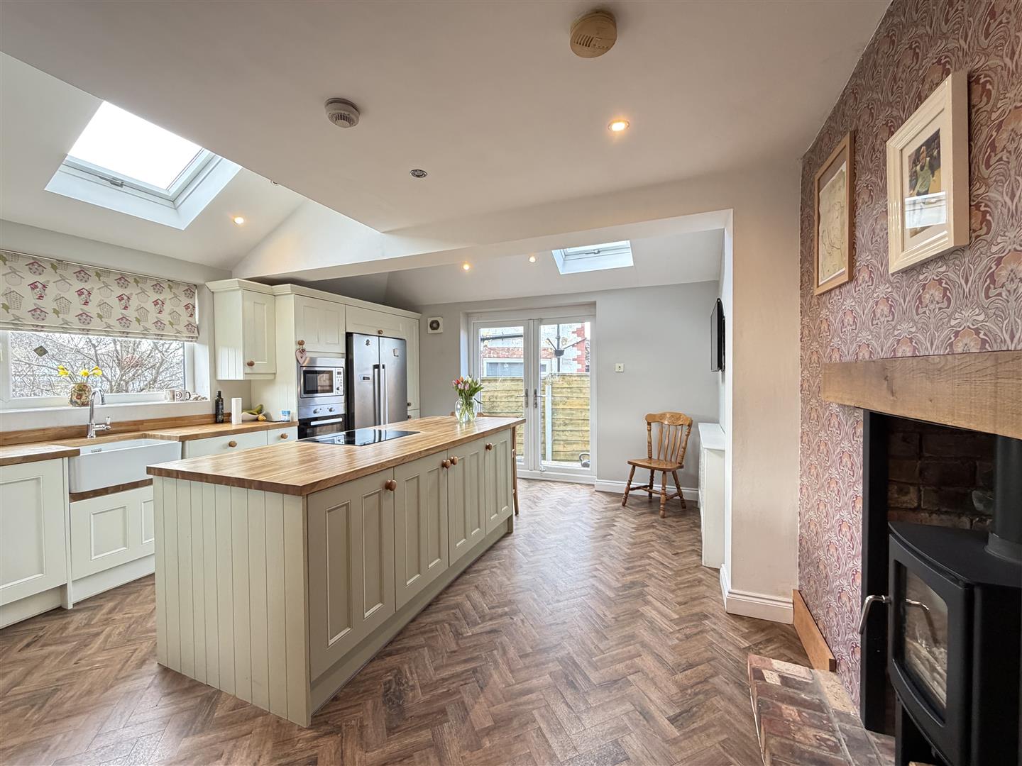 The accommodation is thoughtfully arranged and well proportioned throughout, beginning with a welcoming entrance porch and hallway which set the tone for the remainder of the home. There is a defined dining area ideal for family meals and entertaining, together with a comfortable lounge providing a relaxing living space. To the rear, the bright and spacious kitchen/diner forms the heart of the home and features a log-burning stove, Velux windows allowing for an abundance of natural light, and French doors opening directly onto the rear, creating a seamless connection between indoor and outdoor living.