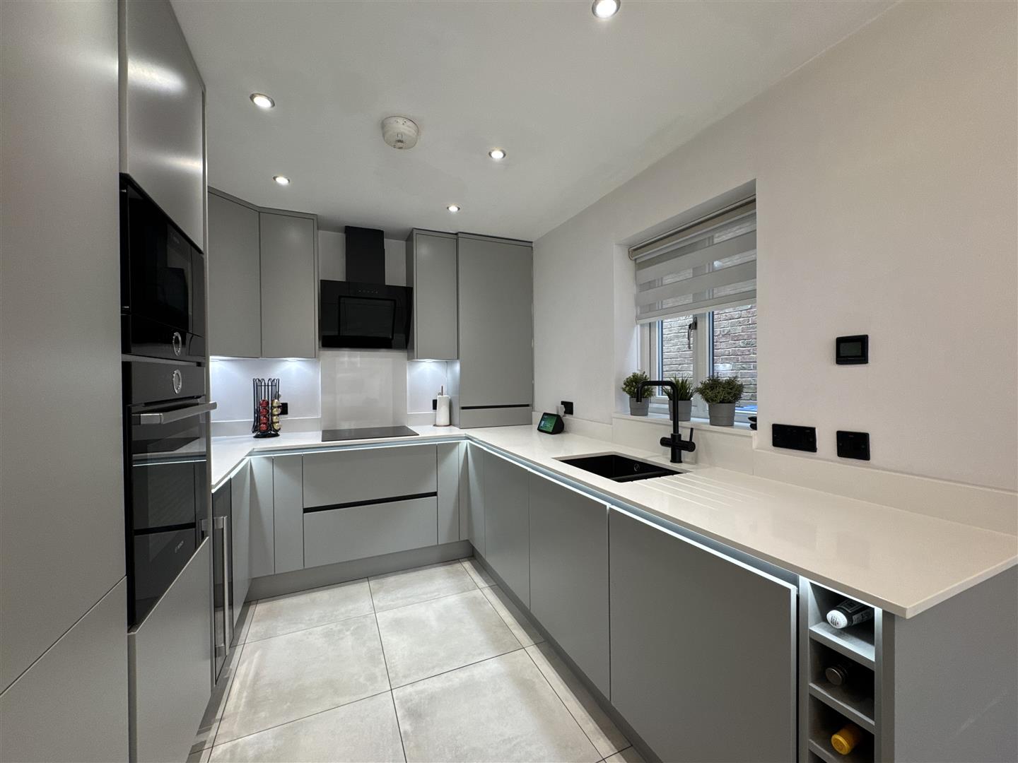 Fitted with a matching range of base and eye level units with worktop space over, inset sink with mixer hot tap, integrated fridge/freezer, built-in oven, built-in hob with extractor hood over, built-in microwave, double glazed box window to front, double glazed window to side, radiator.