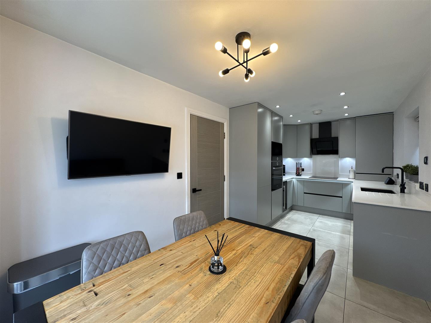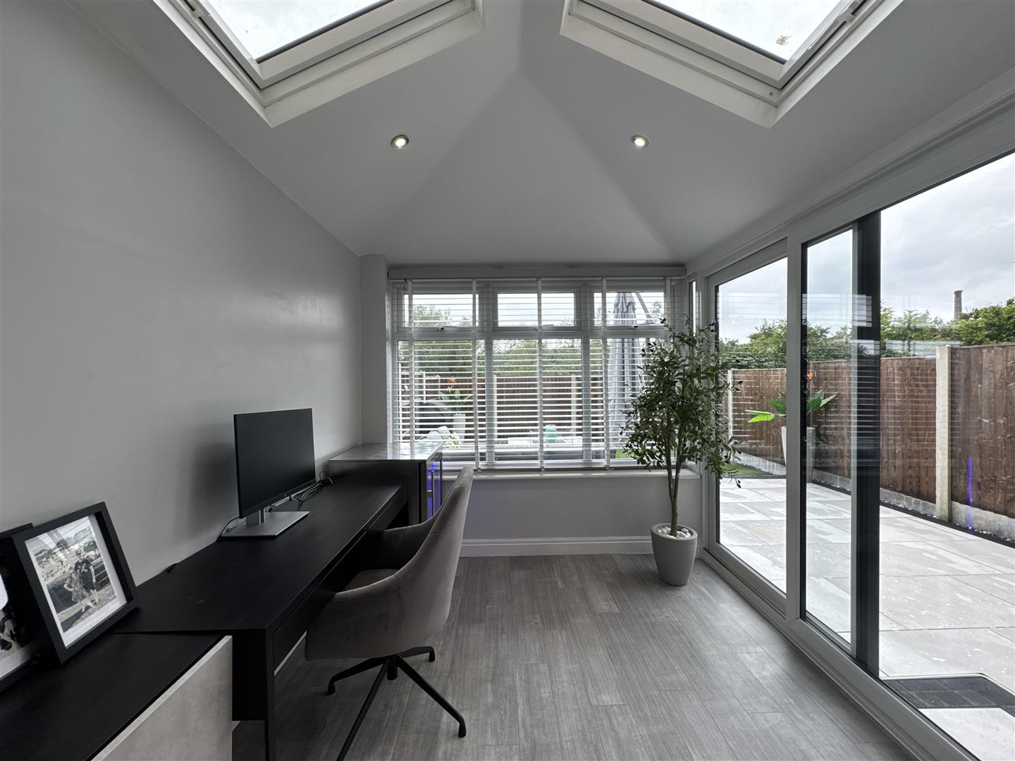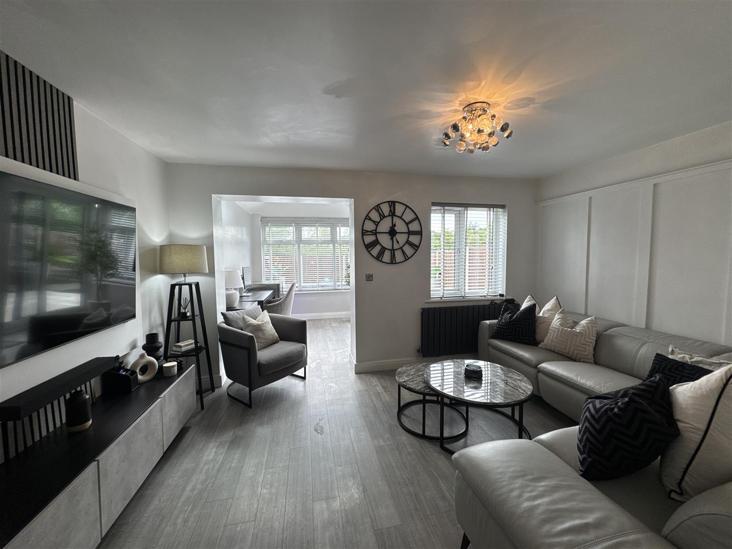 This stunning home is immaculately maintained and thoughtfully designed to suit modern family life, with bright and generous living spaces. Upon entering, you are greeted by a welcoming entrance hall leading to a stylish and contemporary kitchen/diner. The ground floor also offers a handy downstairs WC and a spacious, comfortable lounge which opens via French doors into the beautifully appointed orangery. The orangery is a real feature of the home, with a pitched roof, Velux windows, and further French doors that open directly onto the rear garden, flooding the space with natural light and creating an effortless indoor-outdoor feel.