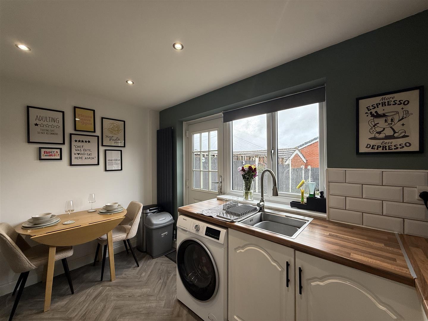 Fitted with a matching range of base and eye level units with worktop space over, inset sink with mixer tap, tiled splashbacks, plumbing for washing machine, space for fridge/freezer, built-in oven, built-in hob with extractor hood over, double glazed window to rear, radiator, door to storage cupboard, door leading out to rear garden.