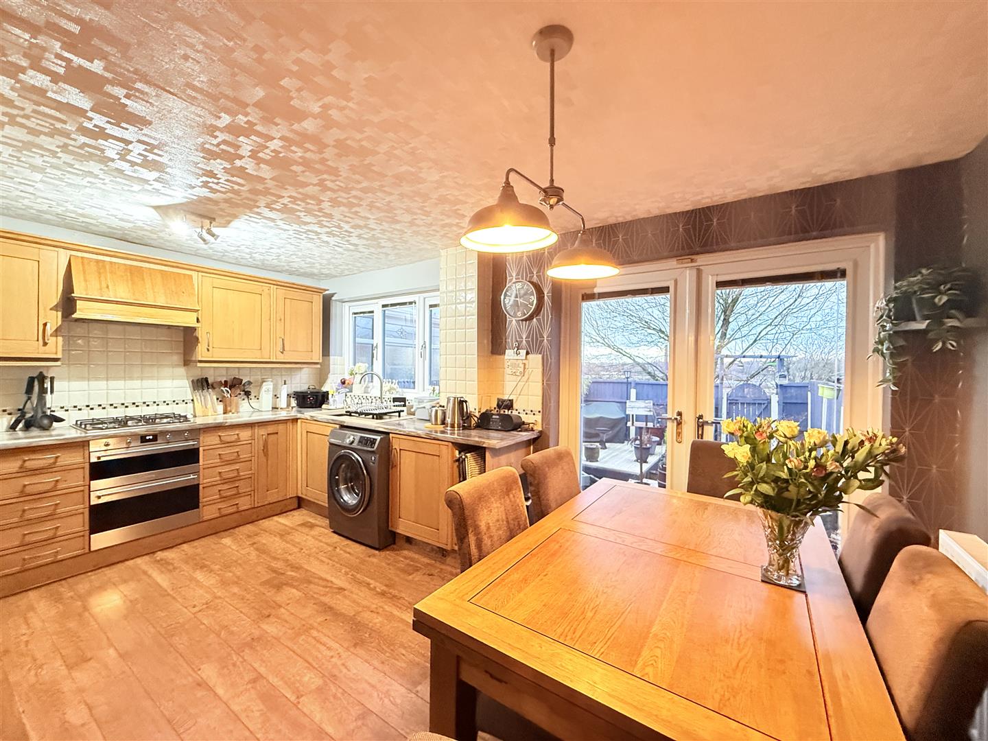 Fitted with a matching range of base and eye level units with worktop space over, inset sink and drainer with mixer tap, tiled splashbacks, integrated freezer, space for fridge/freezer, plumbing for washing machine, double glazed window to rear, radiator, double glazed French doors leading out to rear garden.