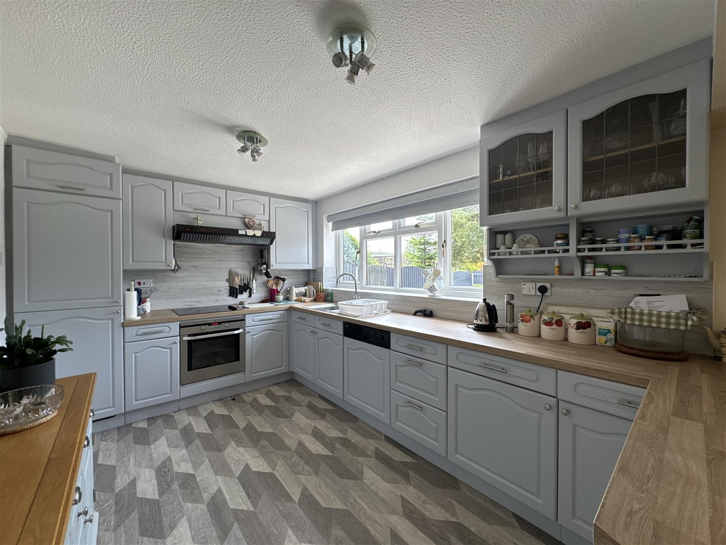 Fitted with a matching range of base and eye level units with worktop space over, inset sink and drainer with mixer tap, integrated fridge/freezer, integrated dishwasher, built-in oven, built-in hob with extractor hood over, double glazed window to rear, radiator, door leading to utility, bi-fold door leading to: