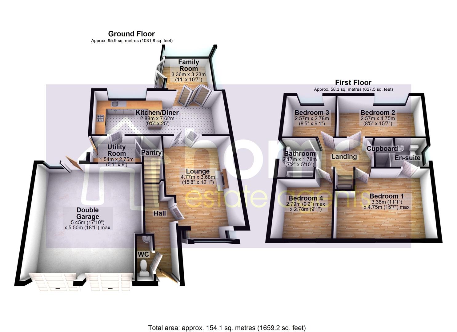 Upstairs, the property offers four well-proportioned bedrooms, including a generous main bedroom with an en-suite shower room. The remaining bedrooms are all spacious and versatile, ideal for children, guests or a home office, and are served by a family bathroom fitted with a three-piece suite.