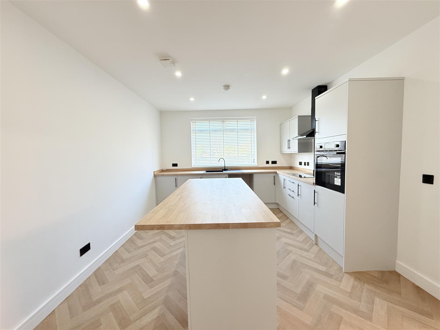 Fitted with a matching range of base and eye-level units, inset sink and drainer with mixer tap, matching island/breakfast bar, built-in eye-level oven, built-in hob with extractor hood over, double glazed window to rear, door leading to: