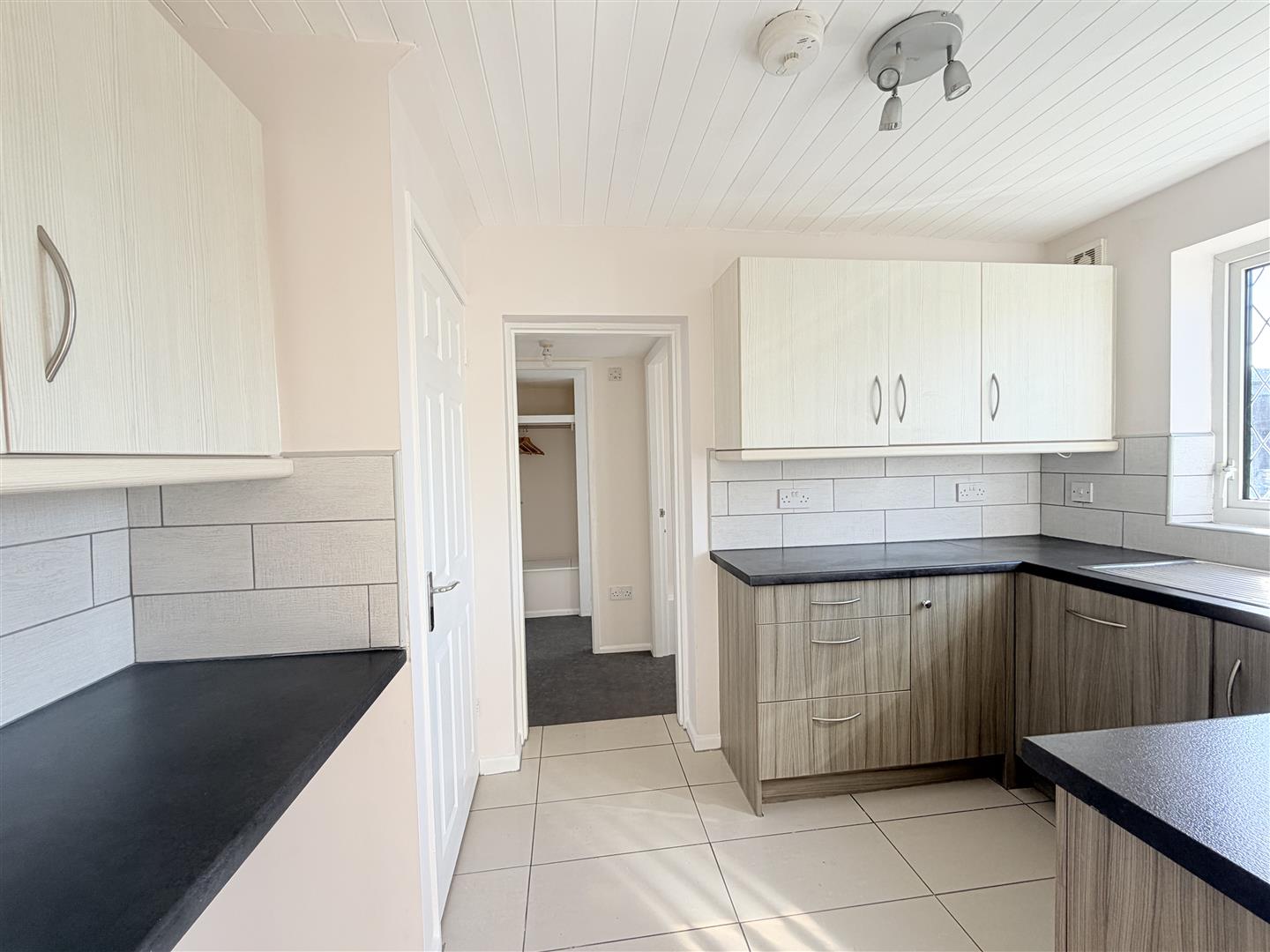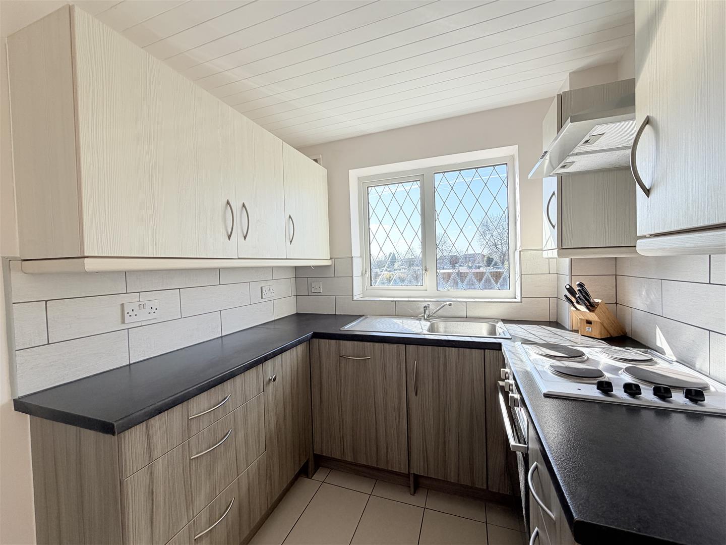 Fitted with a matching range of base and eye level units with worktop space over, inset sink and drainer with mixer tap, tiled splashbacks, built-in oven, built-in hob with extractor hood over, double glazed window to rear, door to storage cupboard, open to:
