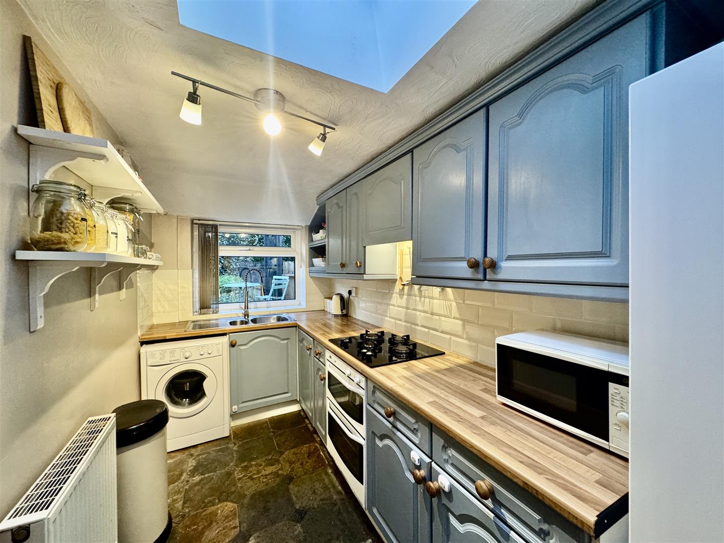 Fitted with a matching range of base and eye level units with worktop space over, inset sink and drainer with mixer tap, tiled splashbacks, plumbing for washing machine, space for fridge/freezer, built-in oven, built-in hob with extractor hood over, radiator, door leading out to rear garden.