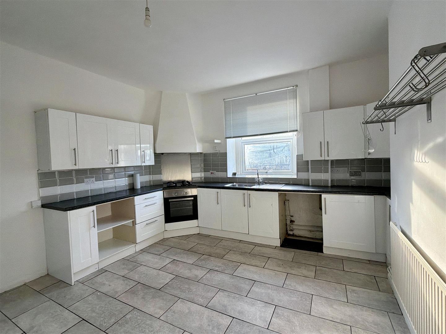 Fitted with a matching range of base and eye level units with worktop space over, inset sink and drainer with mixer tap, tiled splashbacks, plumbing for washing machine, space for fridge/freezer, built-in oven, built-in hob with extractor hood over, double glazed window to rear, radiator, stairs leading to first floor, stairs leading down to:
