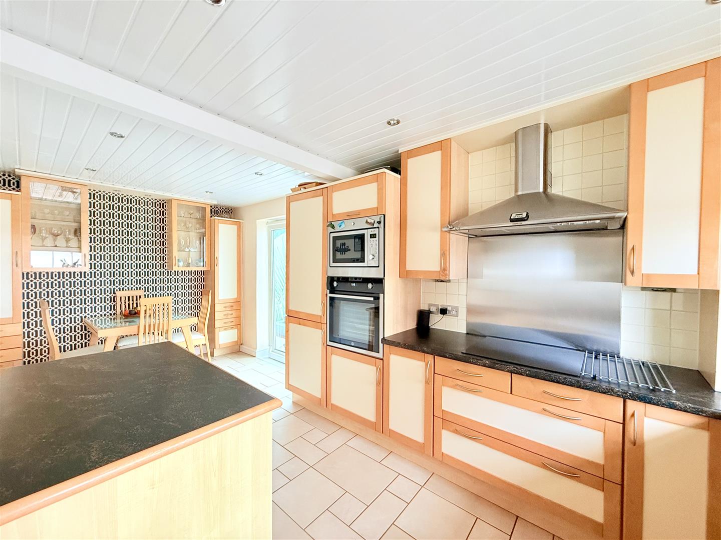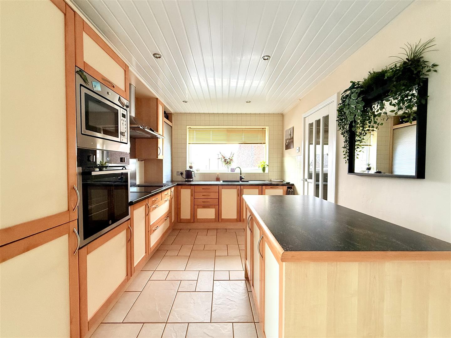Fitted with a matching range of base and eye level units with worktop space over, inset sink and drainer with mixer tap, tiled splashbacks, integrated fridge/freezer, built-in oven, built-in hob with extractor hood, built-in microwave, radiator, double glazed sliding patio door leading to: