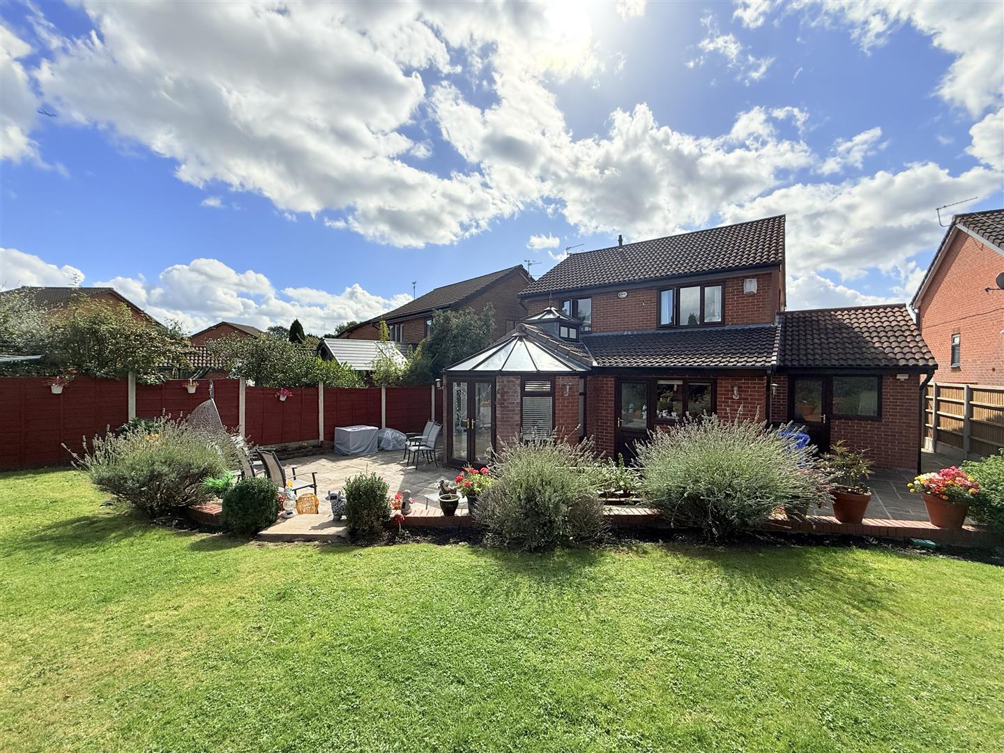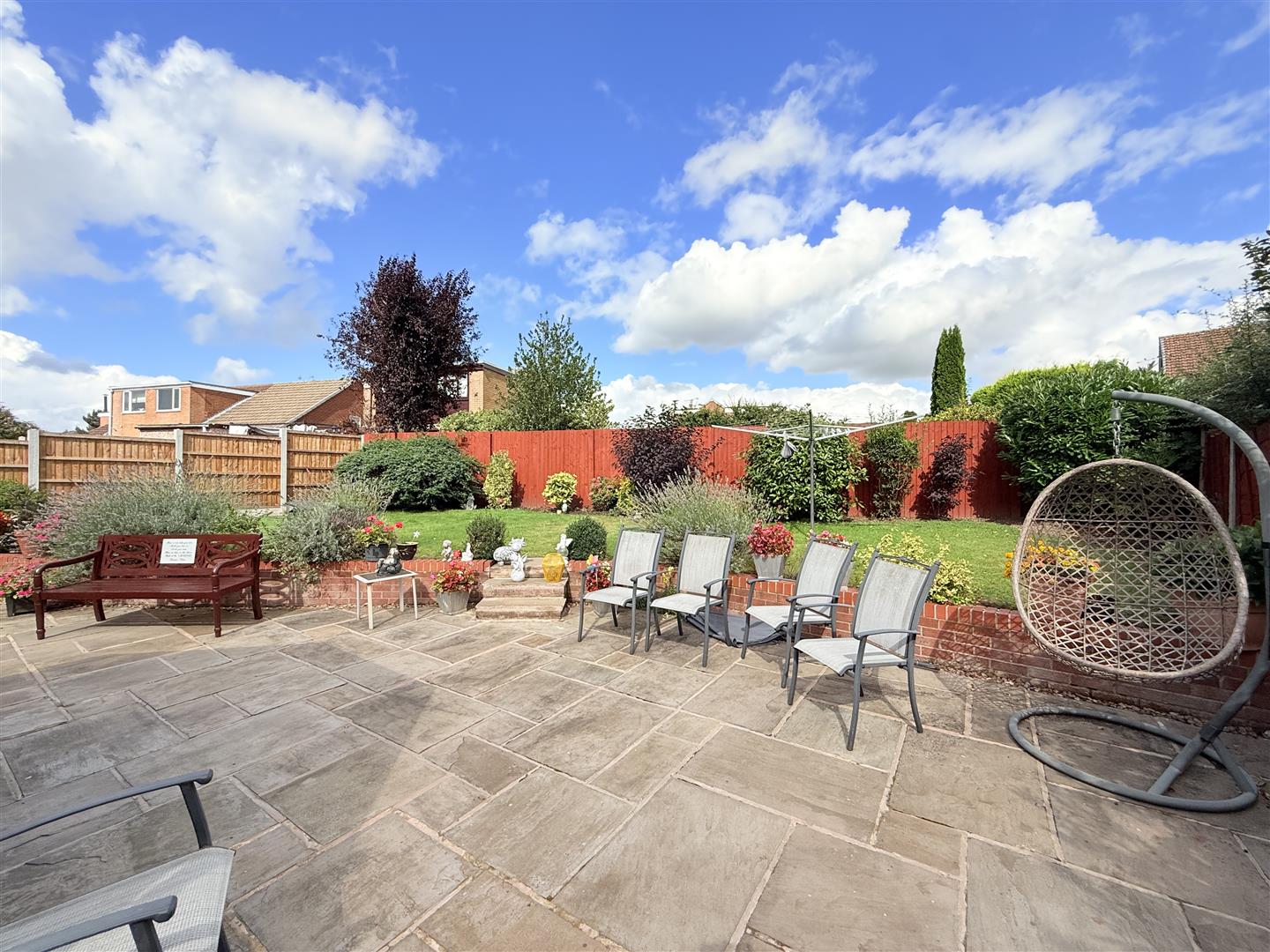 Externally, the rear garden is a true highlight, being both spacious and well-maintained. A large paved patio area provides the perfect space for outdoor dining and entertaining, with steps leading up to a lush lawn surrounded by well-stocked planted borders, shrubs, and mature trees, offering both privacy and a tranquil setting.