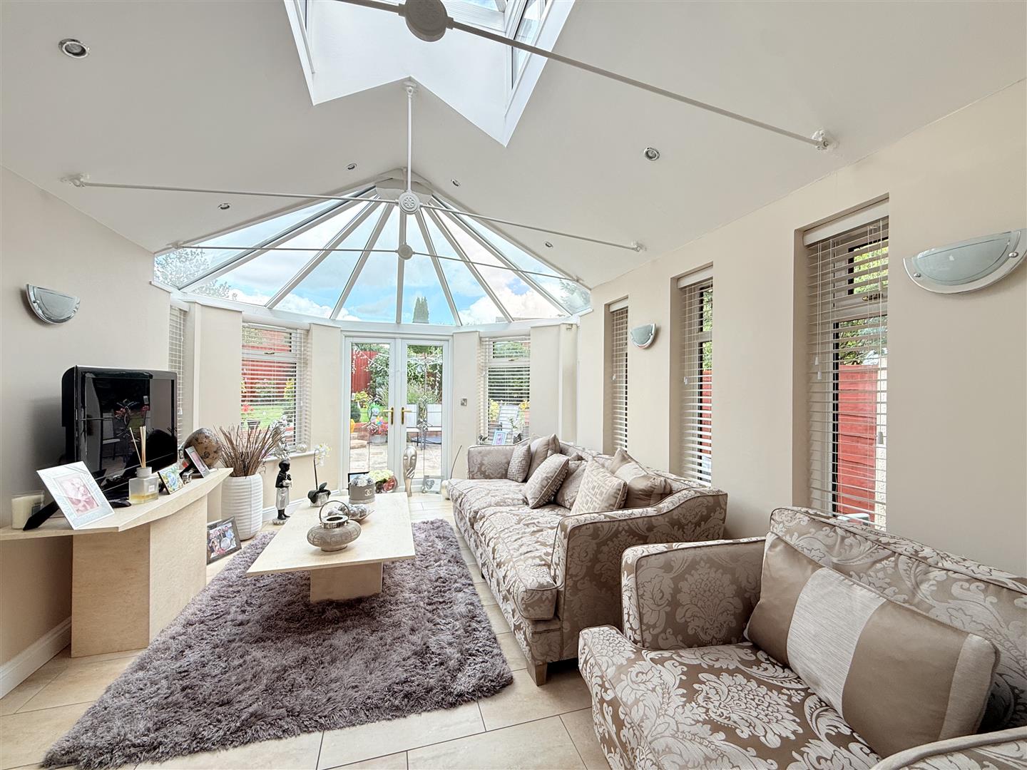 Double glazed windows to sides, pitched solid roof with skylight, half conservatory roof, double glazed French doors opening out to rear garden.