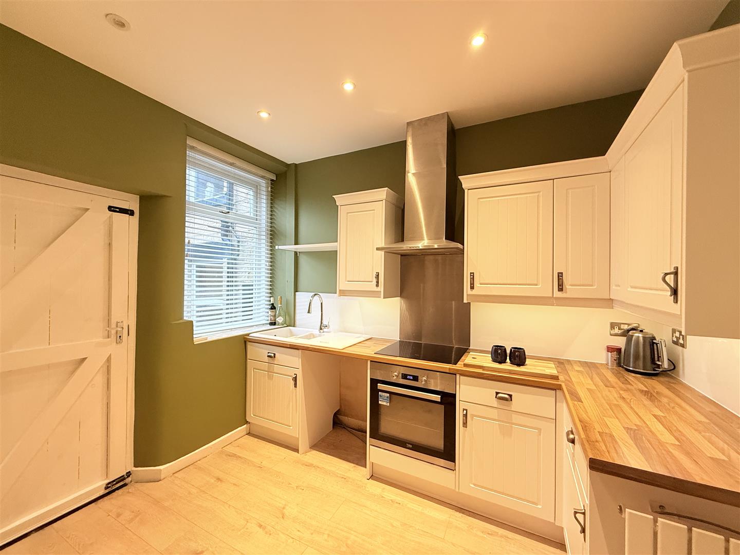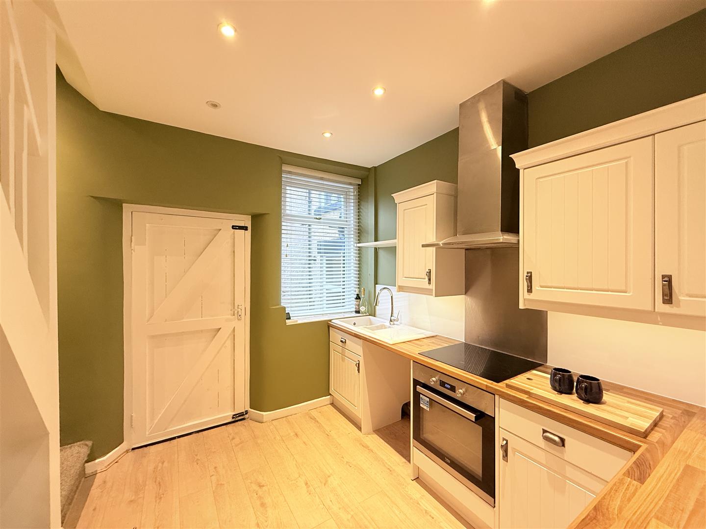 Fitted with a matching range of base and eye level units with worktop space over, inset sink and drainer with mixer tap, tiled splashbacks, plumbing for washing machine, space for fridge/freezer, built-in oven, built-in hob with extractor hood over, double glazed window to rear, stairs leading to first floor, door leading out to rear.