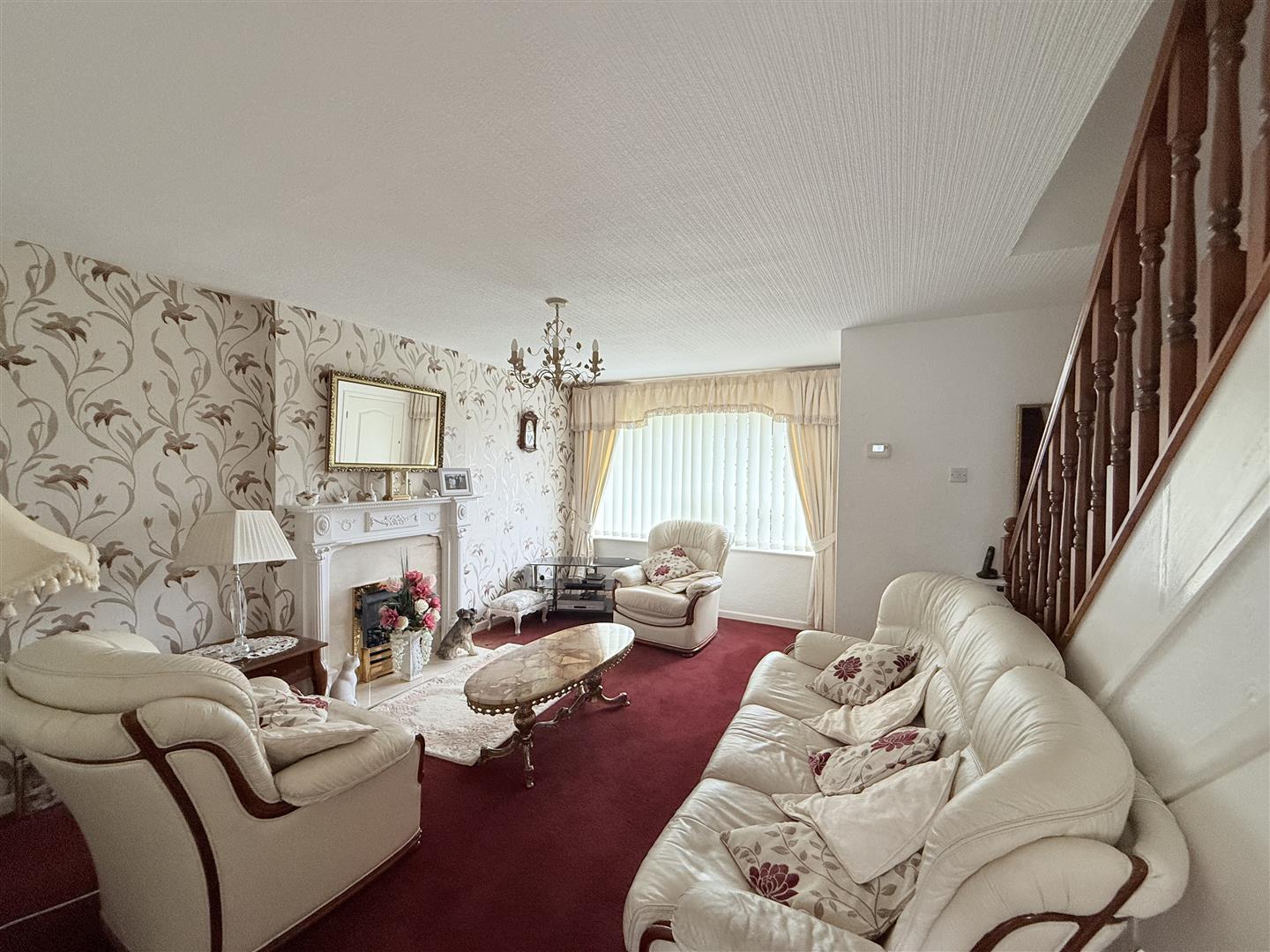 Double glazed bow window to front, feature fireplace with inset living flame effect fire, radiator, stairs leading to first floor, door to storage cupboard, door leading to: