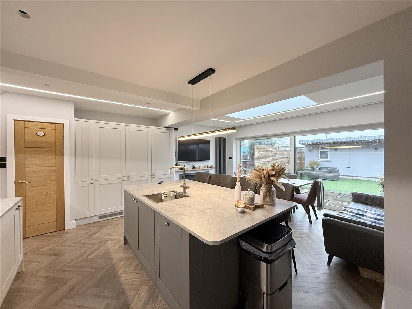A standout feature is the impressive kitchen extension, which is enhanced by full-length sliding doors that flood the space with natural light and seamlessly connect the indoors with the outdoor area. This modern kitchen with integrated appliances is perfect for culinary enthusiasts and family gatherings alike.