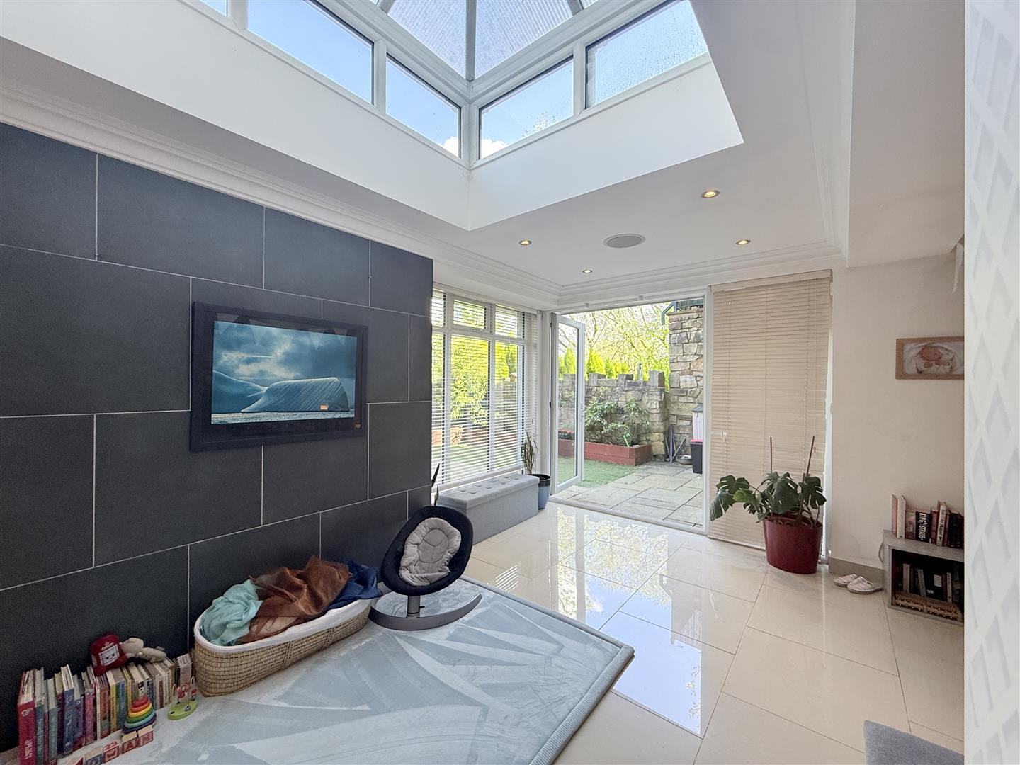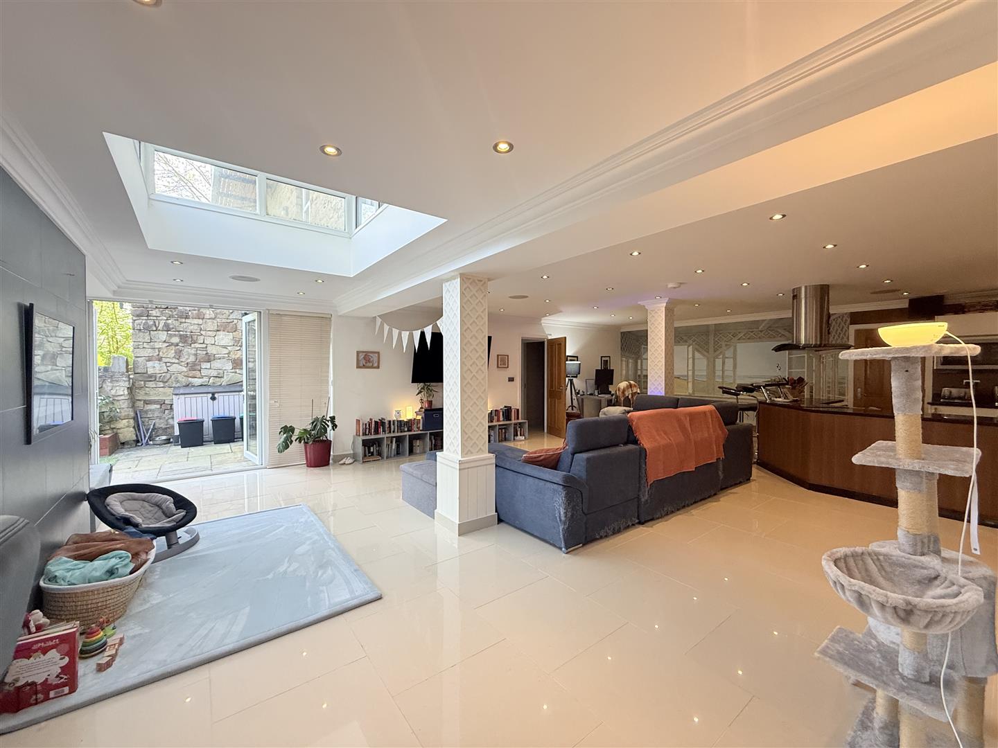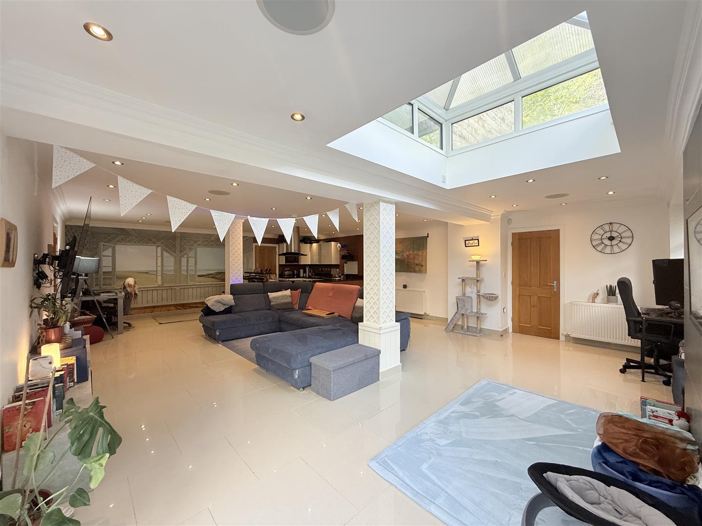 Two full height double glazed windows to front, feature roof window, three radiators, fitted with a matching range of base and eye level units with decorative lighting, granite worksurface over, inset sink and drainer with mixer tap, built-in oven and hob with ceiling extractor above, integrated fridge/freezer and dishwasher, tiled floor, inset ceiling downlights, double doors leading out to garden, door leading to storage area.