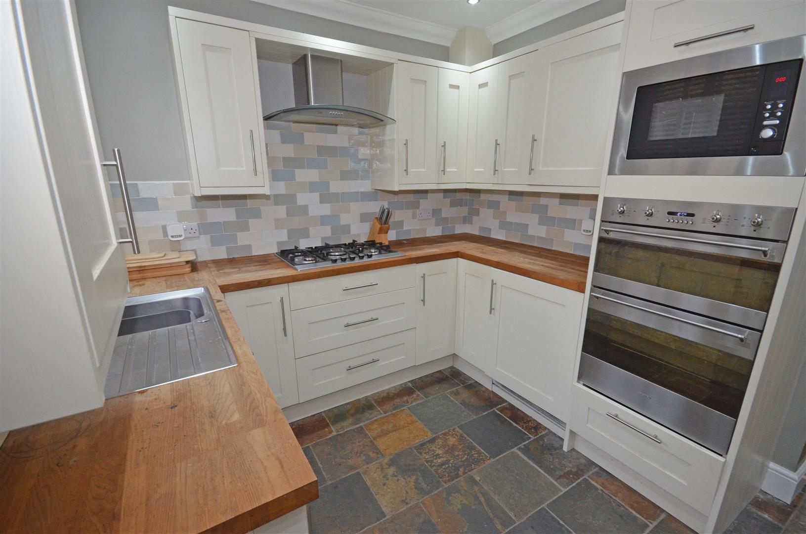 Double glazed window to the rear and fitted with a matching range of white base and eye level units with wooden work tops over, single drainer sink, fitted five ring gas hob with extractor hood above and electric double oven, fitted microwave, integrated fridge and freezer, integrated dishwasher, freezer, plumbing and space for automatic washing machine, tiled flooring, part tiled walls, double glazed stable door to the rear garden, gas central heating boiler, inset ceiling spot lights and radiator.
