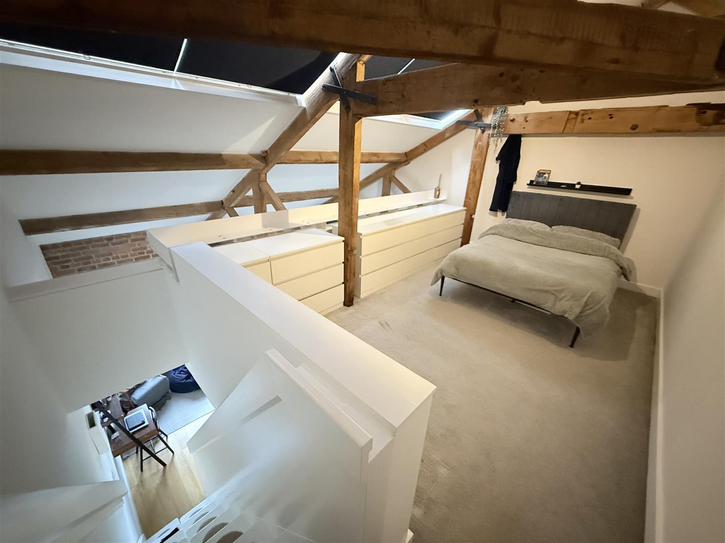 Four skylights in roof as the apartment is on the top 3rd floor. Stairs leading down