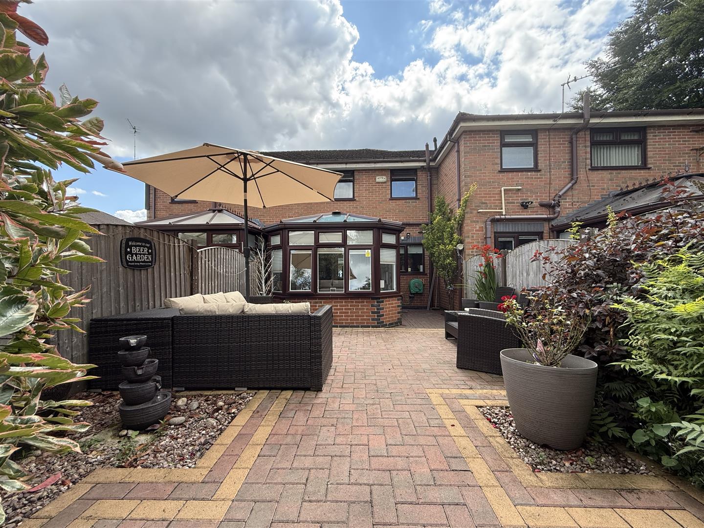 The rear garden features a paved patio area with garden seating and an umbrella, surrounded by mature shrubbery for privacy. A separate section offers a shed and additional planting beds, creating a pleasant outdoor space for relaxation and storage.