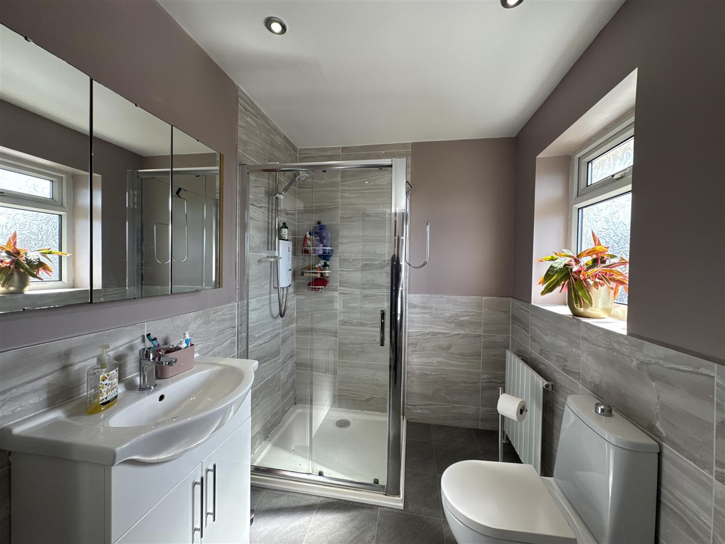 Three piece suite comprising shower enclosure, vanity wash hand basin and low-level WC, tiled walls, double glazed window to side, heated towel rail.