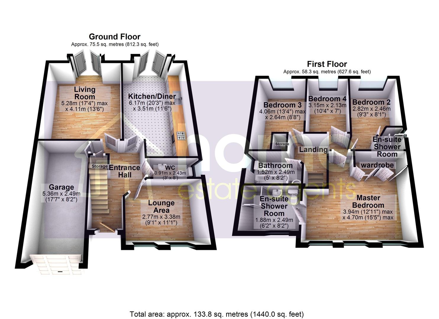 The first floor presents four generously sized bedrooms, two of which benefit from their own en-suite shower rooms, offering privacy and convenience for a growing family. The additional bedrooms are equally well-proportioned and are served by a modern family bathroom, making the layout both practical and versatile.