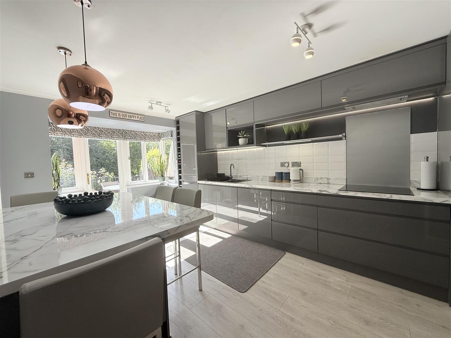 Fitted with a matching range of base and eye level units with worktop space over, matching breakfast bar/dining area, inset sink and drainer with mixer tap, tiled splashbacks, space for fridge/freezer, built-in eye level double oven, built-in hob with extractor hood over, double glazed box window to rear, door leading out to rear garden, radiator.