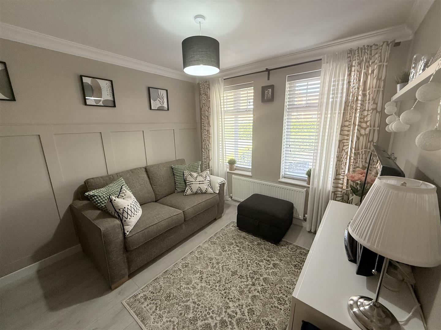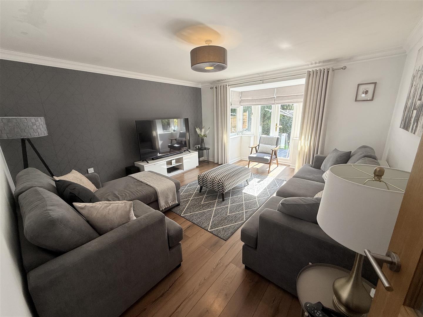 Upon entering, you are greeted by a welcoming hallway that sets the tone for the space and style found throughout. The ground floor boasts a light and comfortable lounge area, a handy WC, and a sleek, contemporary kitchen/diner designed with both family life and entertaining in mind. A separate living room at the rear of the property provides an additional versatile reception space, with French doors opening directly onto the garden and allowing natural light to fill the room.